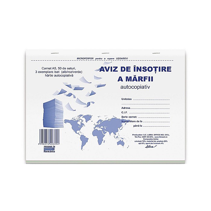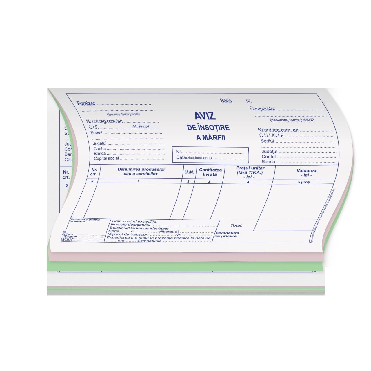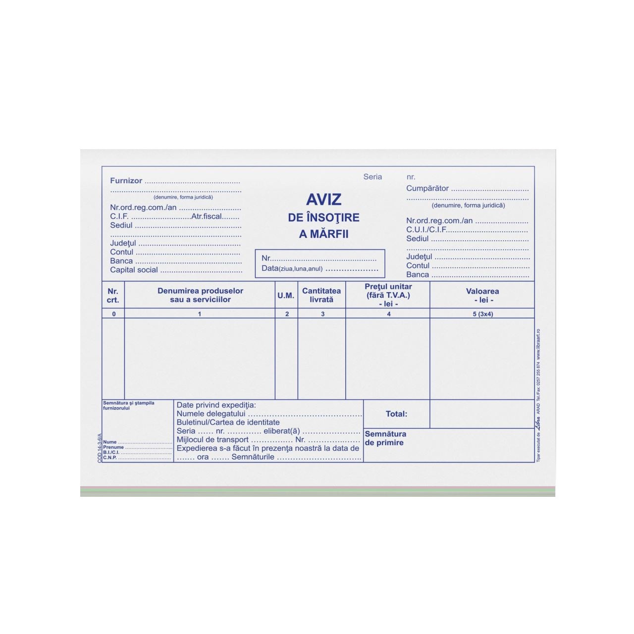 Etichete: aviz de insotire a marfii, A5, 150 file, L03394, formular document, însoțire expediere, detalii comandă, informații transport, produs legal, confirmare livrare, specificări marfă, transparentă proces, document administrativ, utilizare comercială, completare corectă, scop oficial