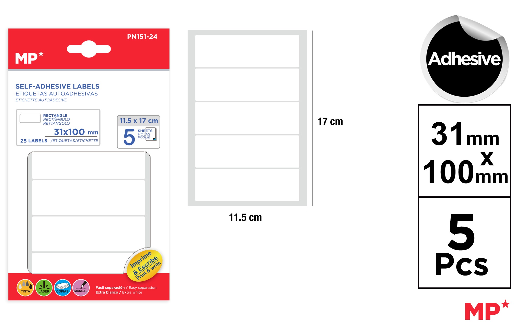 Adhesive labels for inkjet and laser printers,photocopiersas well as manual writing. Rectangularshape:31 x 100 mm. White. Easy to separate. Sheetmeasurements:115 ?— 170 mm. Packs of 5 sheets. 25labels.