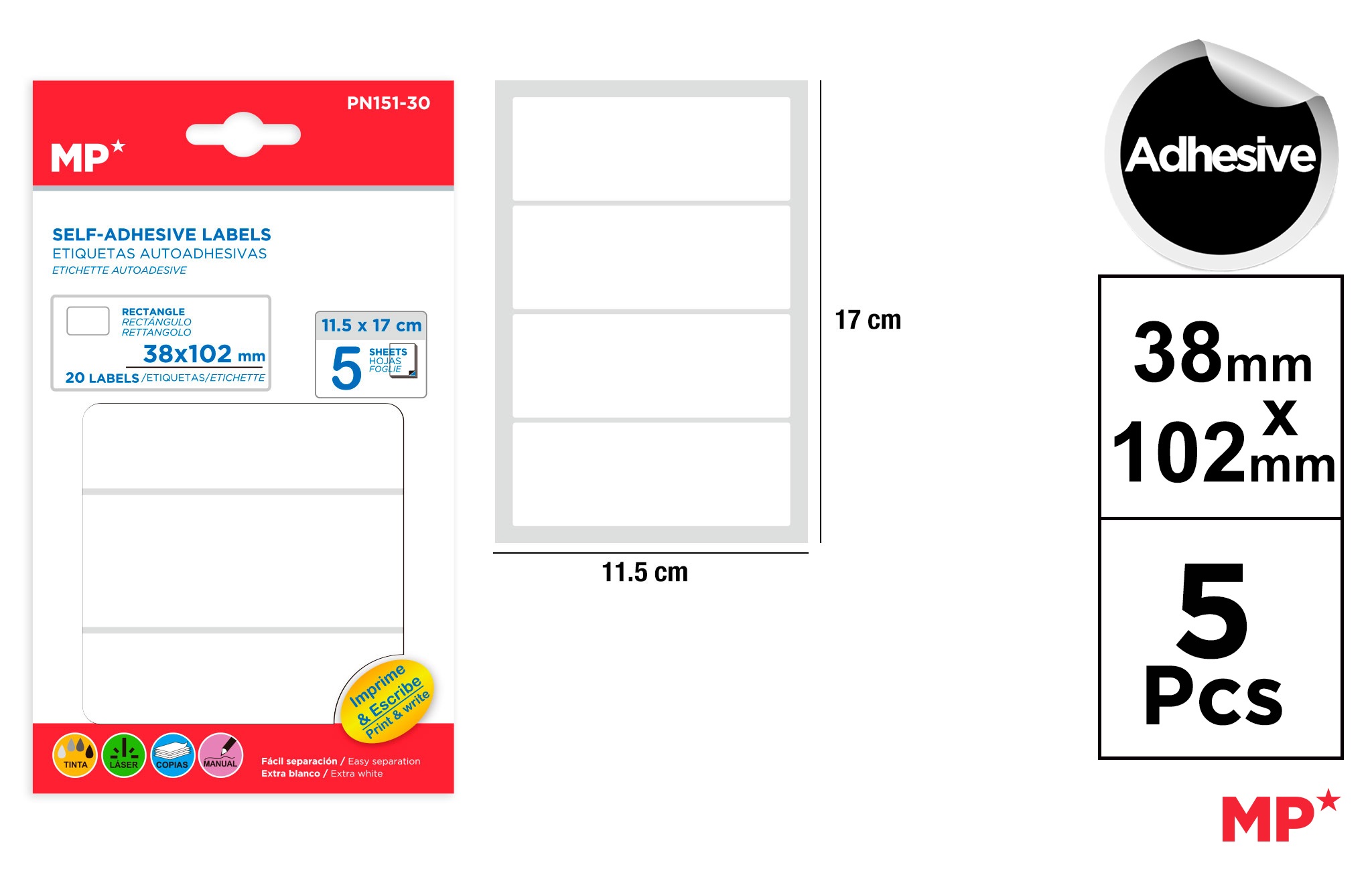 Adhesive labels for inkjet and laser printers,photocopiersas well as manual writing. Rectangularshape:38 x 102 mm. White. Easy to separate. Sheetmeasurements:115 ?— 170 mm. Packs of 5 sheets. 20labels.