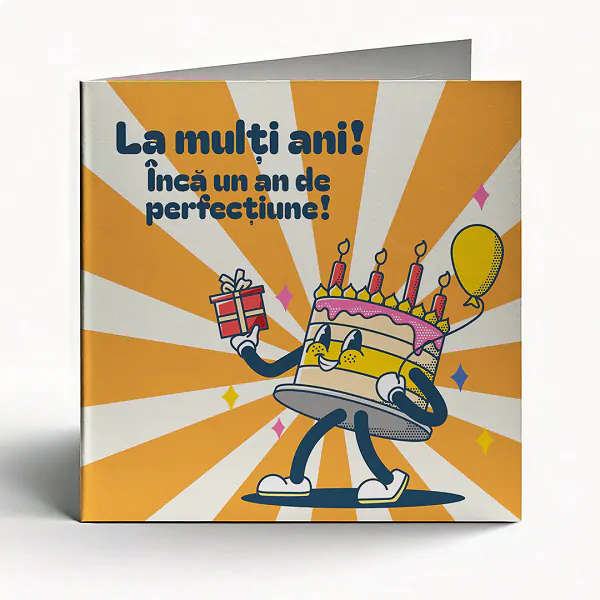 Specificatii: Design tort animat, Mesaj coperta "La multi ani! Incă un an de perfecțiune!", Interior alb pentru mesaj personal, Universal (10-99 ani)
