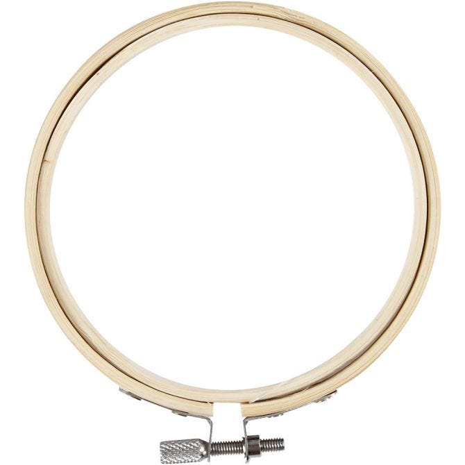 Round wooden embroidery frame with a metal buckle. Can be used both as a tool to stretch and attach the fabric to be embroidered/ painted, and as a frame for display