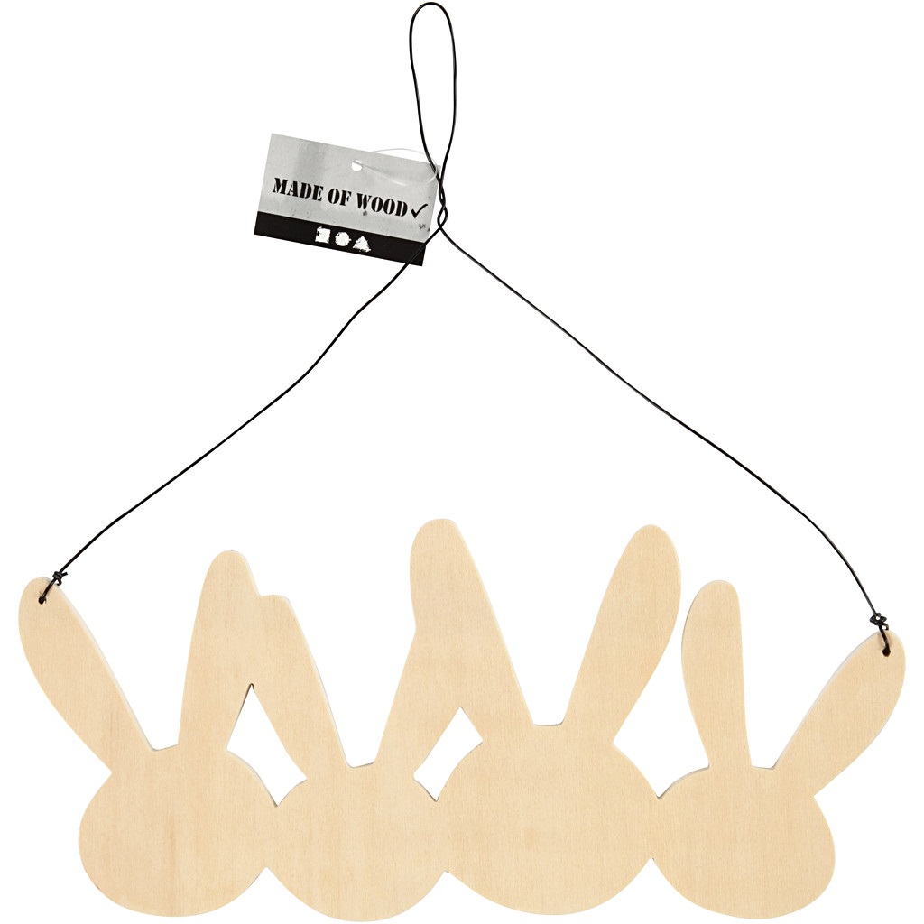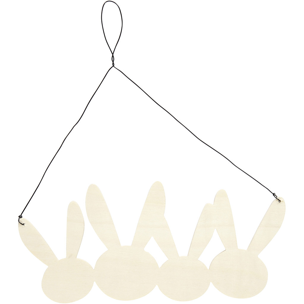 Suspension consisting of 4 continuous rabbits in light wood with suspension of black metal wire. . H: 11 cm, W: 25 cm, thickness 0,7 cm