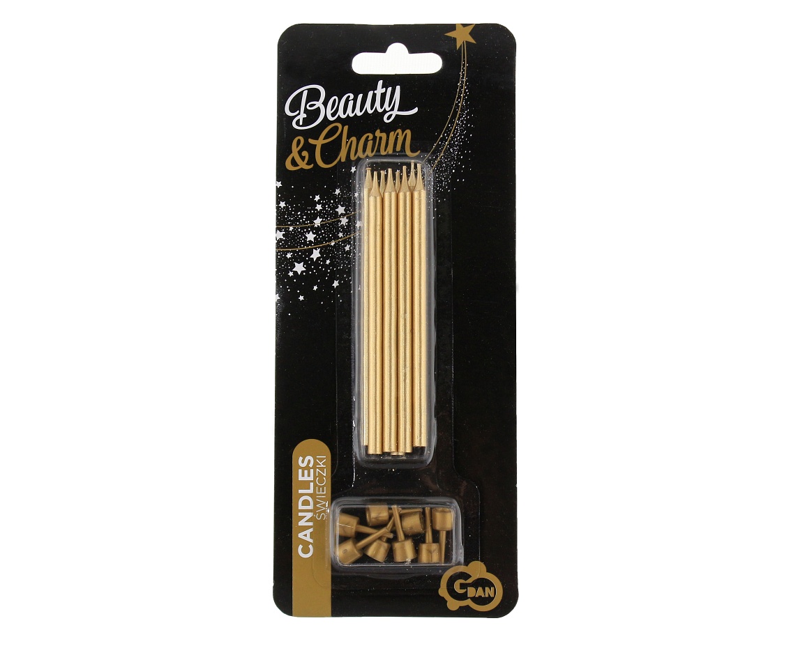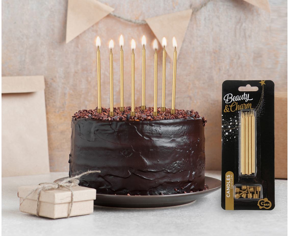 Lumanari elegante, aurii pentru tort din colectia Beauty & Charm. Mai lungi decât lumânările obișnuite (până la 10 cm), vor fi un decor fenomenal pe tort, aprinzând emoții în rândul invitaților tăi. Coastele realizate cu grijă vă vor permite să atașați cu ușurință lumânările de tort și să vă asigurați stabilitatea. Capetele profilate corespunzător ale suporturilor vă permit să atașați ușor lumânările, astfel încât să nu vă faceți griji că vă vor strica tortul frumos. Designul grațios și culoarea aurie orbitoare fac din lumânările noastre lungi B&C un decor perfect pentru toate sărbătorile și ocaziile importante.