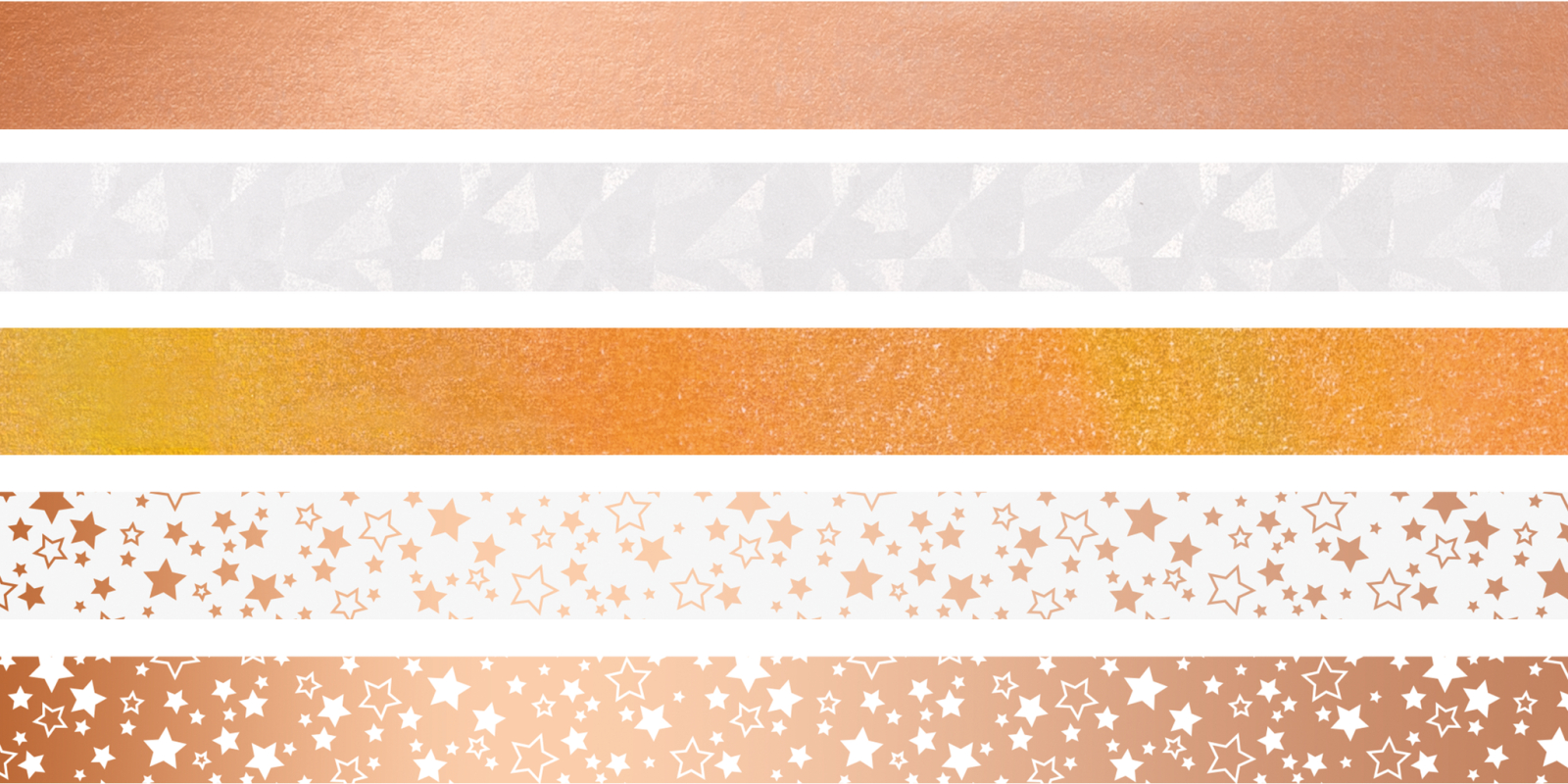 Setul conține 5 rulouri cu motive diferite, ambalate într-un dispenser din plastic. Banda este realizată din hârtie în culoarea modernă Aur Roz (Rose Gold). Finisajul este foarte lucios și are un efect parțial irizant, adăugând un element sofisticat oricărui proiect.
