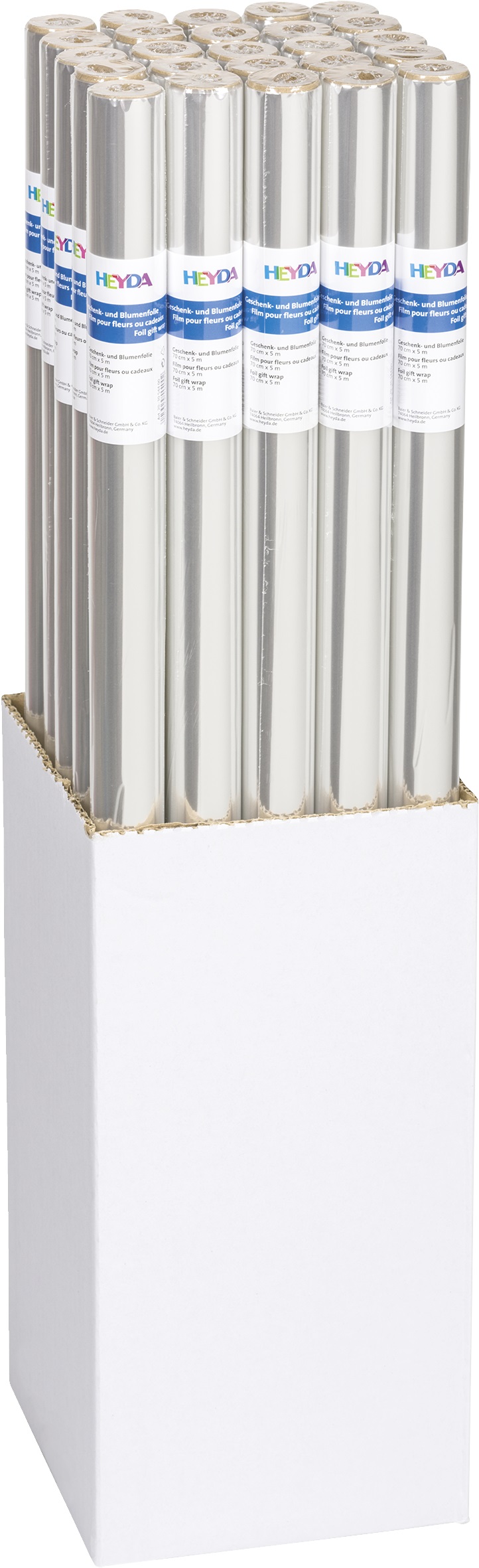 rola de celofan cu miez de hârtie calitate fermă, cristalină 70 x 500 cm, display approx. 23 x 23 x 45 cm rolls with paper core firm crystal clear quality 20 my individual in foil, 25 rolls in white display box