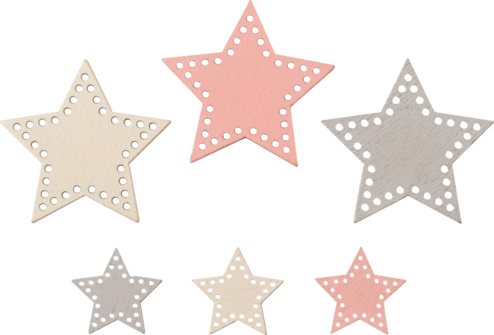 Acest set variat de ornamente din lemn, sub formă de stele, este un accesoriu excelent pentru proiecte de artizanat și decorațiuni. Figurinele sunt realizate din placaj și vin în nuanțe asortate de fildeș (ivory), roz deschis și gri deschis, perfecte pentru tematici delicate.