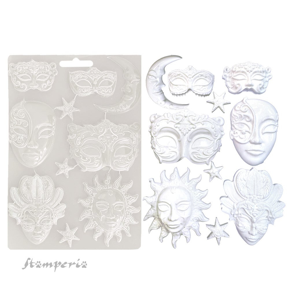Design Detaliat: Matrița include mulaje complexe (măști de tip lup și mască completă, decorațiuni tribale cu pene, simboluri precum Luna și Soarele, și steluțe).