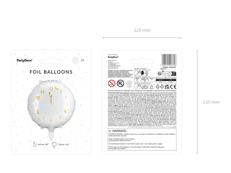 Adaugă o notă elegantă petrecerii tale cu balonul din folie de aluminiu alb cu ceas. Acesta are un diametru de aproximativ 45 cm (18'') înainte de umflare și aproximativ 35 cm (14'') după umflare. Balonul este de culoare albă, iar designul cu ceas este realizat în culoare aurie. Poate fi umflat cu aer sau heliu și setul include și o paie pentru umflare.