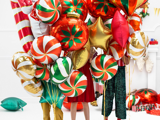Matt foil balloon Christmas Bauble in red colour with green and gold metallic print, size approx. 45 x 45 cm (18 x 18 '').