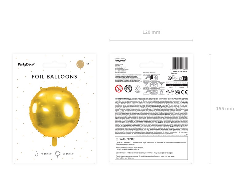 Balon rotund cu efect de oglindă, de culoare aurie, dimensiune înainte de umflare aproximativ 45 cm (18''), dimensiune după umflare aproximativ 35 cm (14''). Se poate umfla cu aer sau heliu. Setul conține o paie.