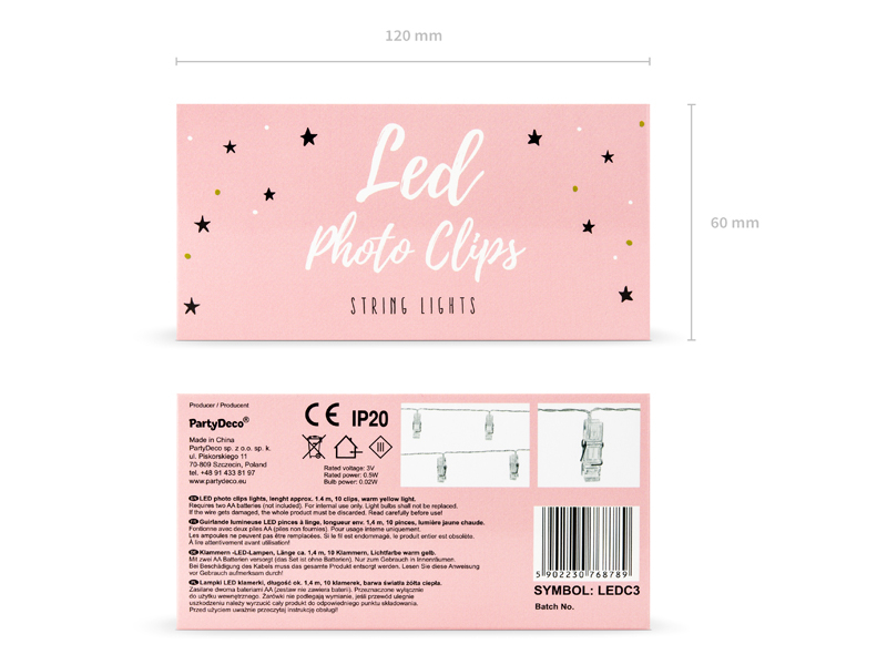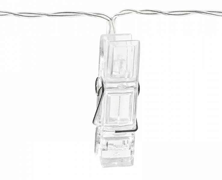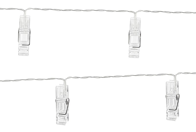 LED photo clips lights, clear on clear wire, length of wire with lights approx. 1.4 m, 10 clips, warm yellow colour of the light. Suitable for both indoor and outdoor use. Battery operated. Lights can not be connected with any light sets. Rated voltage: 3V; Rated power: 0.5W; Bulb power: 0.02W