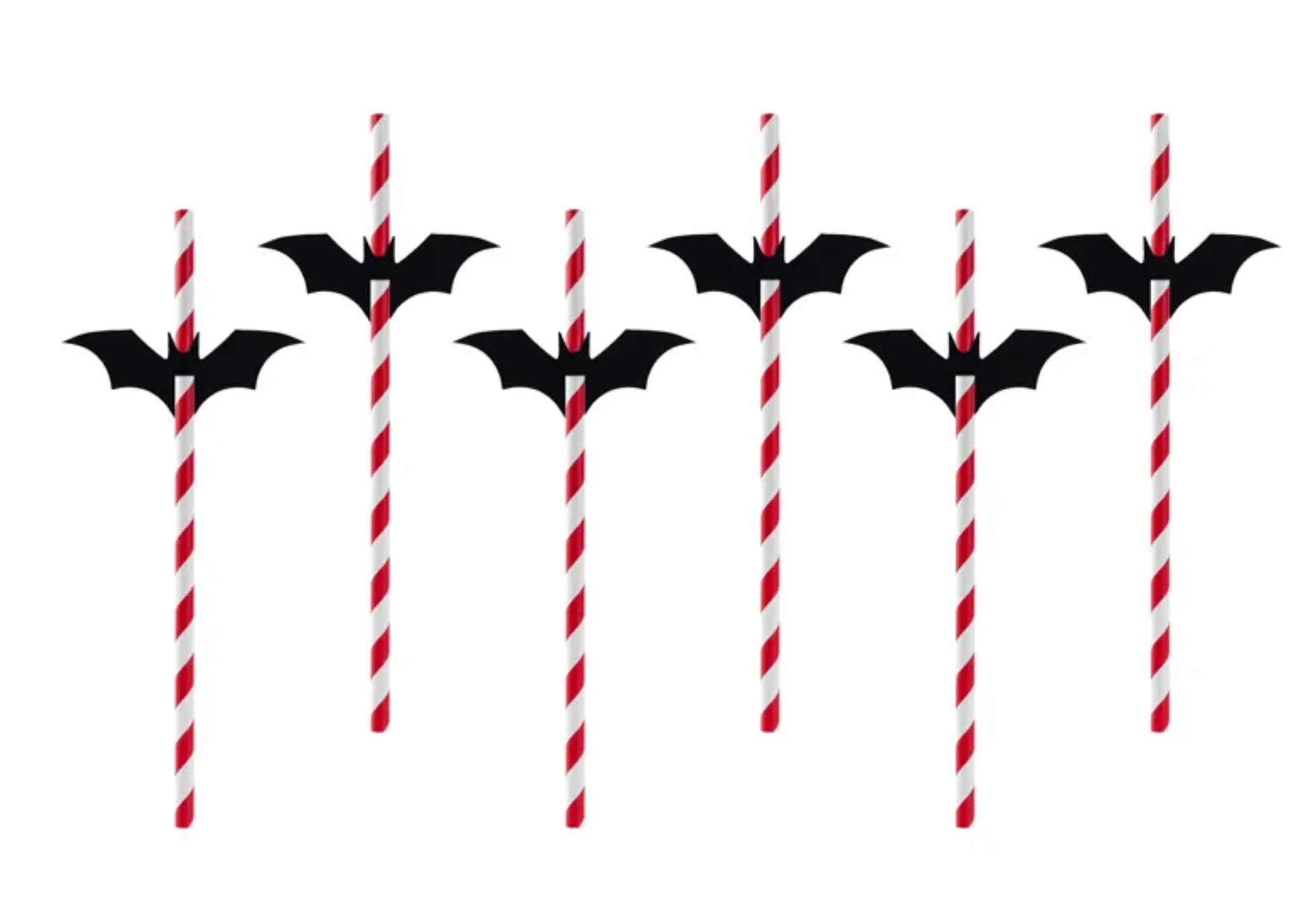 Halloween straws, red, with black bats, length 19,5 centimeters. (1 pkt / 6 pc.)