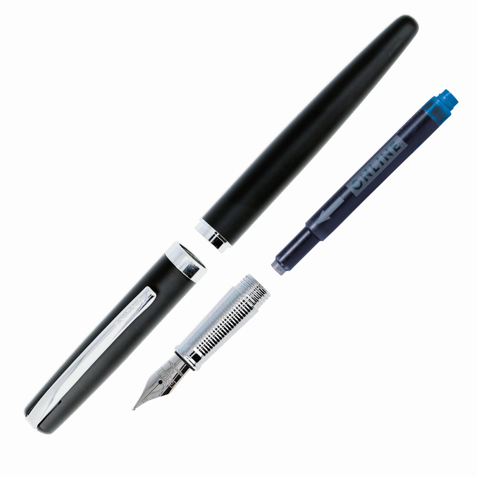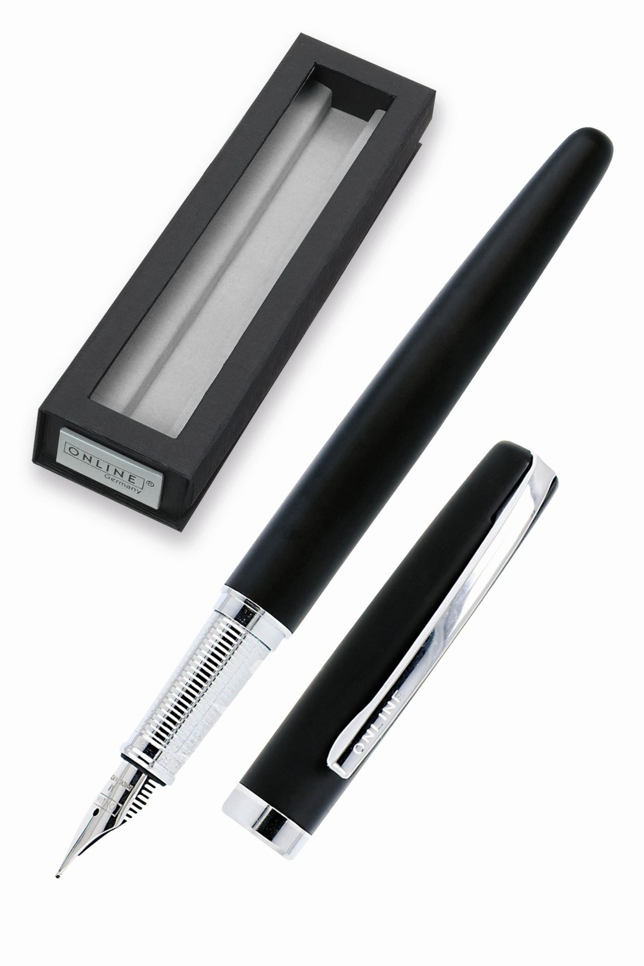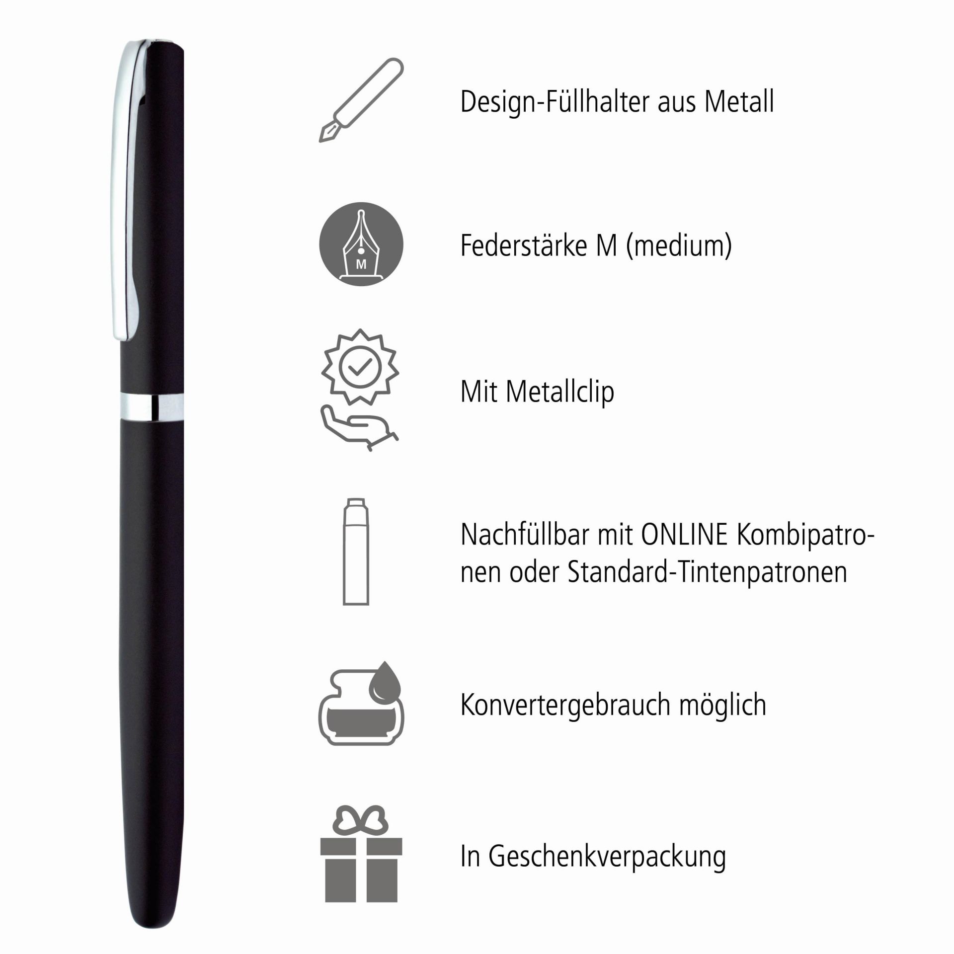 This ONLINE design metal fountain pen is equipped with a high-quality M nib (medium) and offers the highest level of writing. Delivered in the stylish box, every writing instrument is an elegant gift. Standard cartridges, converter possible; ONLINE grants a 5-year warranty on the iridium nib.