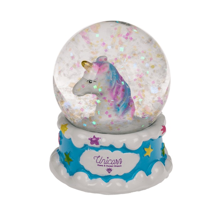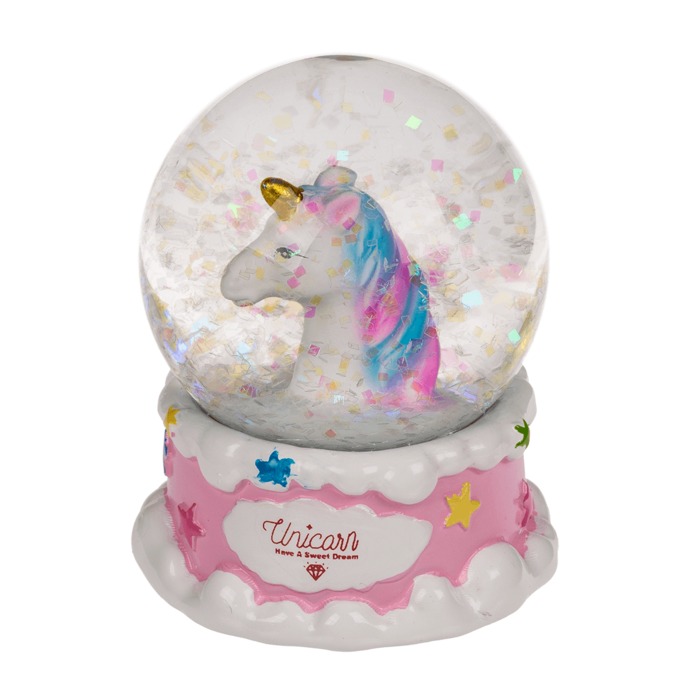 Globul are dimensiunile aproximative de 6 x 4,5 cm și este realizat din polirasină, un material rezistent și durabil, care permite o detaliere fină și o strălucire intensă a sclipiciului. Cu un cap de unicorn și decor nor, acest glob aduce un aer fermecător și plin de poveste oriunde este expus.