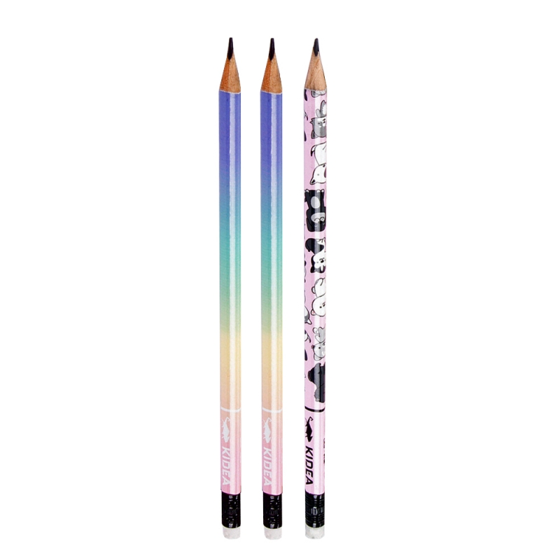 Creioane cu imprimeuri simpatice. Puteți alege creioane în nuanțe pastelate cu efect ombre și un creion cu animale drăguțe într-o culoare roz delicată. Forma ergonomică și triunghiulară facilitează prindere corectă și asigură o utilizare confortabilă. Creioanele din lemn cu stylus HB și radieră sunt perfecte pentru a învăța să scrieți și să desenați.