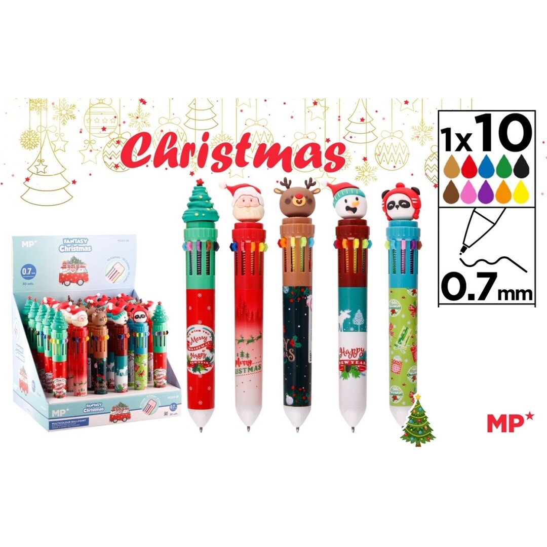 Etichete: pix multicolor, design atrăgător, 10 culori într-un singur pix, Scriere fluidă și netedă, Vârf subțire de 0.7 mm, Linii fine și precise, Cerneală cu culori vii, Gamă variată de culori, Design cu tematică de Crăciun, Magie și culoare în scriere.