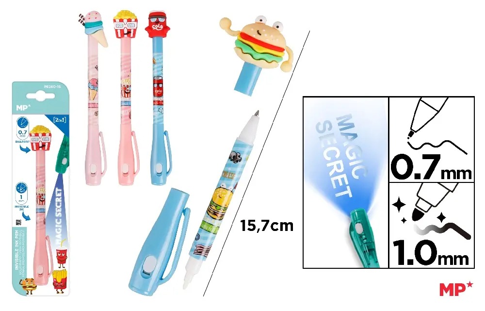 Pix IPB cu Gel Invizibil Lunch Time PE260-15 este un pix inovator, perfect pentru adăugarea unui element de distracție și mister în notițele și mesajele tale. Acest pix utilizează cerneală invizibilă care devine vizibilă doar sub lumina UV, ideal pentru a crea mesaje secrete și surprize.