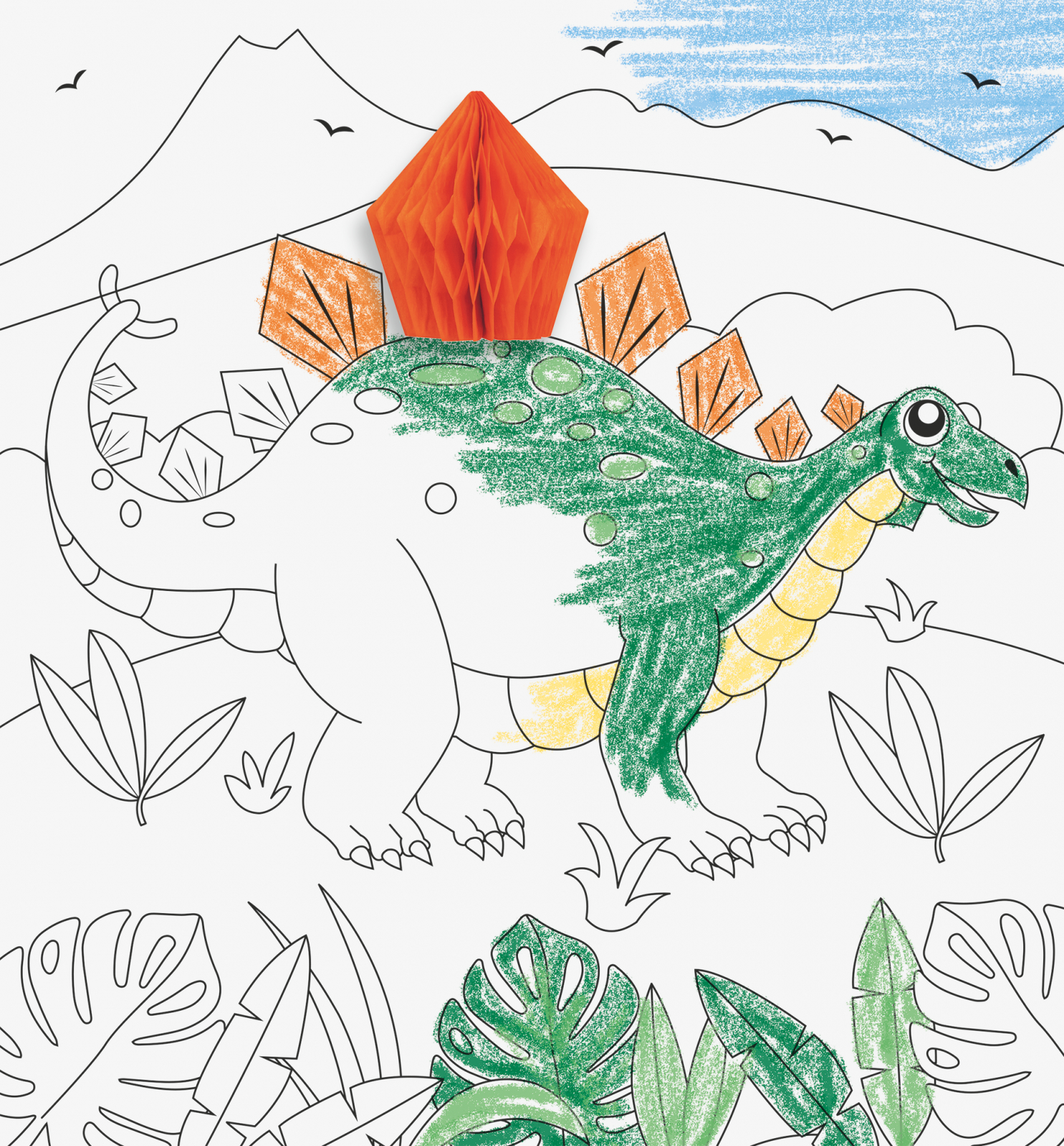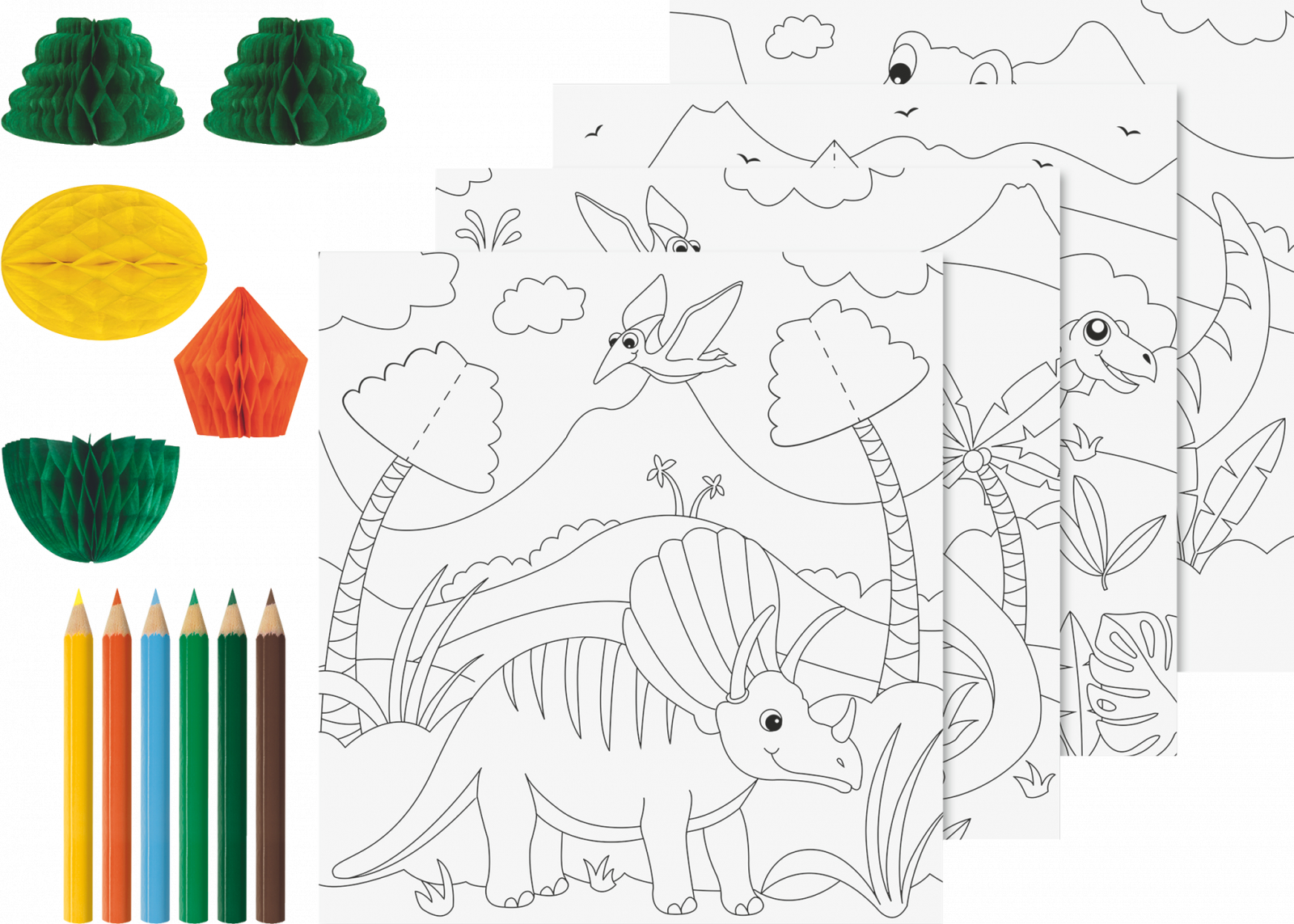 🅰️ Setul include 4 carduri ilustrate pentru colorat cu dinozauri, în dimensiuni de 195×210 mm, și 6 creioane colorate pentru a aduce la viață scenele, alături de ochi mobili și stickere din hârtie cu efect 3D pentru decorare suplimentară