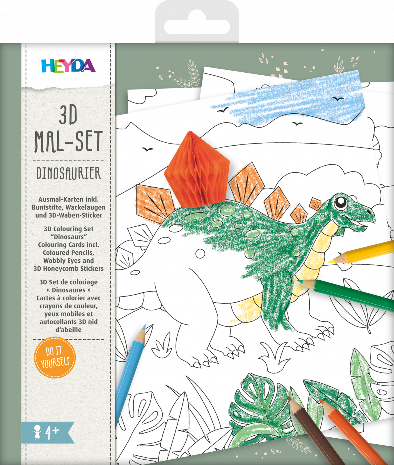 Descoperă setul KP DE COLORAT 3D 19.5*21CM DINOSAUR 4870766 de la Heyda, perfect pentru cei mici de peste 4 ani, oferind o experiență de colorare și decorare tridimensională cu stickeri din hârtie cu efect 3D.