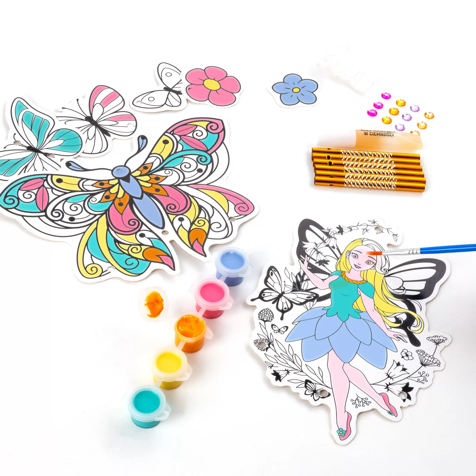 | Conținut Cheie | 6 Clopoței, 7 Șabloane Zână/Fluture, Gel Strălucitor, 5 Vopsele, 12 Diamante |