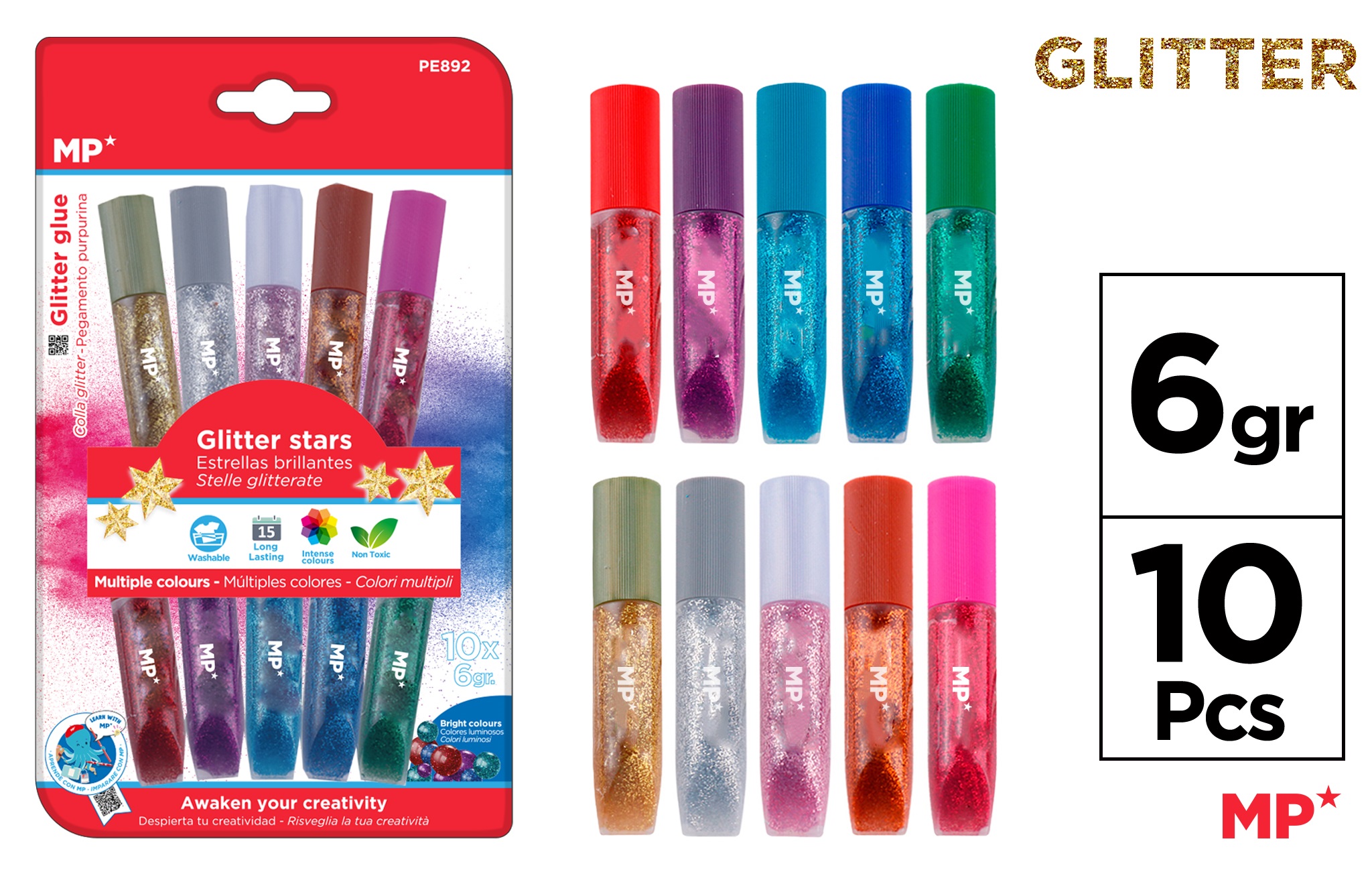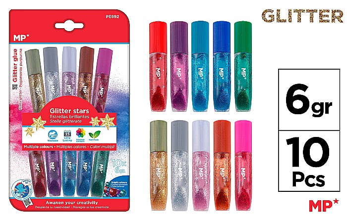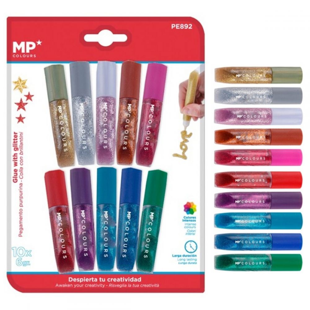 Lipici cu sclipici MP Colours, ideal pentru decoratiuni si activitati de lucru manual, ce se doresc a avea un aspect stralucitor. Poate fi aplicat pe suprafete precum: carton, lemn, polistiren. Setul contine 6 culori de lipici cu sclipici: roz, maro, lila, argintiu, auriu, verde, bleu, albastru, mov, rosu. Mod de ambalate: tub transparent flexibil, cu varf tip carioca de 2 mm, pentru o aplicare usoara. Pretul se refera la un set de 10 culori x 6g.