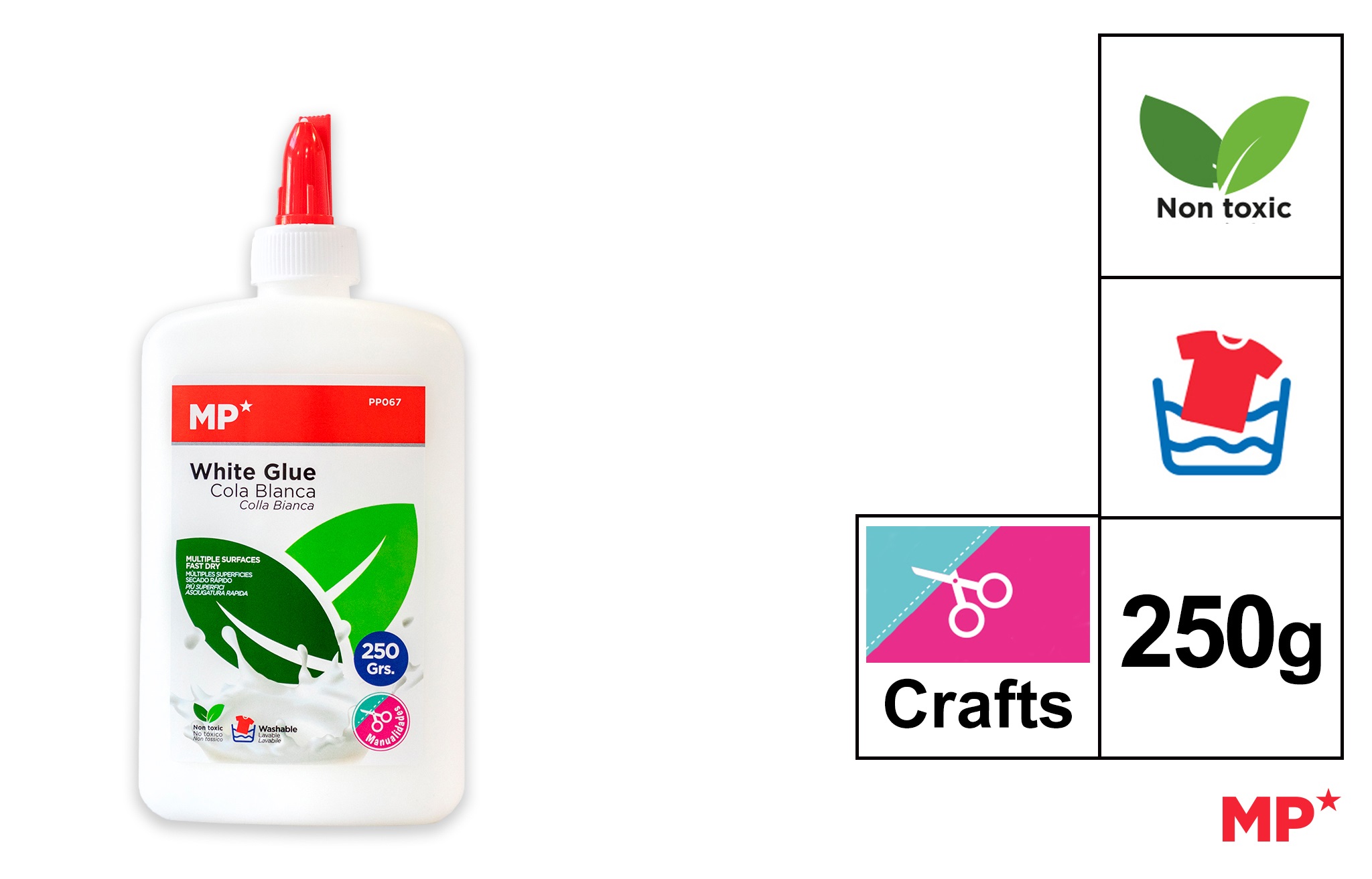 White glue for crafts and multiple surfaces. Doesnotwrinkle the paper. With dispenser tip forclean,quick-drying results. It can be washed byremovingitself from fabrics. Non-toxic. 250 gbottle.
