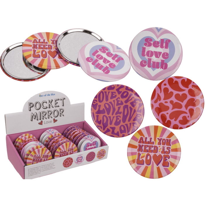 Aceasta este o oglindă de buzunar rotundă, cu tematica "Love". Dimensiunile oglinzii sunt de 7.5 x 8 cm. Produsul este disponibil în 4 modele asortate, iar prețul este per bucată.