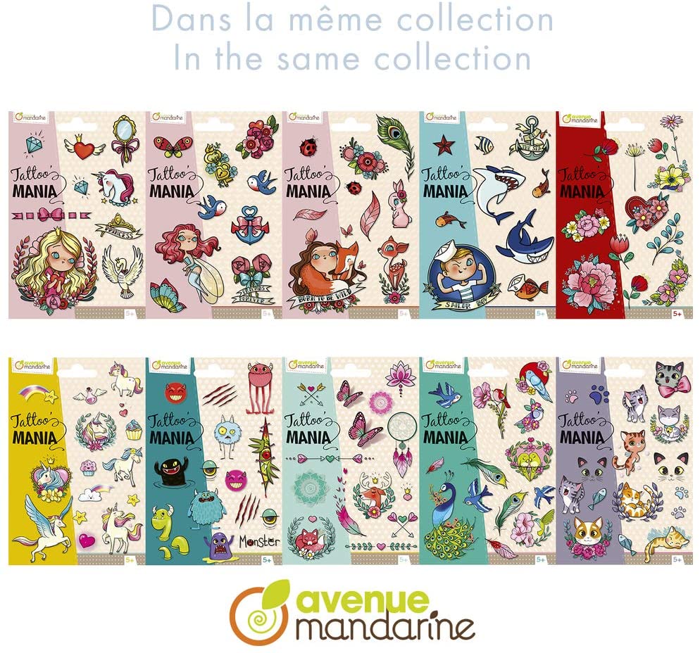 Avenue Mandarine CC052C - Geantă A Tattoo' Mania care include 1 foaie de tatuaje 12,8x9 cm, Unicorni Avenue Mandarine este un brand francez de jocuri educative aparținând grupului Clairefontaine Rhodia. Produsele noastre de înaltă calitate îndeplinesc cerințele dumneavoastră pentru a vă satisface dorintele copiilor și a-i însoți în descoperirea, jocul și trezirea simțurilor lor. Tăiați un model, îndepărtați foaia de protecție, aplicați desenul pe pielea copilului, frecați timp de 30 de secunde și copilul dumneavoastră va fi tatuat ca un adult. Modele colorate, originale, care vor mulțumi copilul dumneavoastră. Pas cu pas inclus. Conform standardelor CE - De la 5 ani. Conține 1 foaie de 10,5x16 cm cu aproximativ 10 tatuaje.