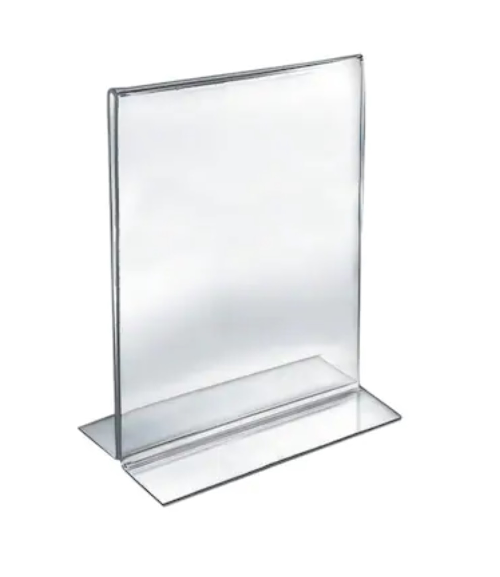 Suport din plastic transparent tip T, ideal pentru a afisa orice material informativ tiparit pe masa, birou, tejghea sau orice alta suprafata orizontala in receptii, birouri, sali de conferinta, holuri si sali de asteptare.