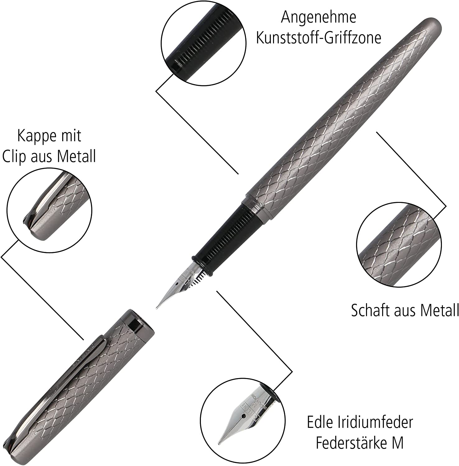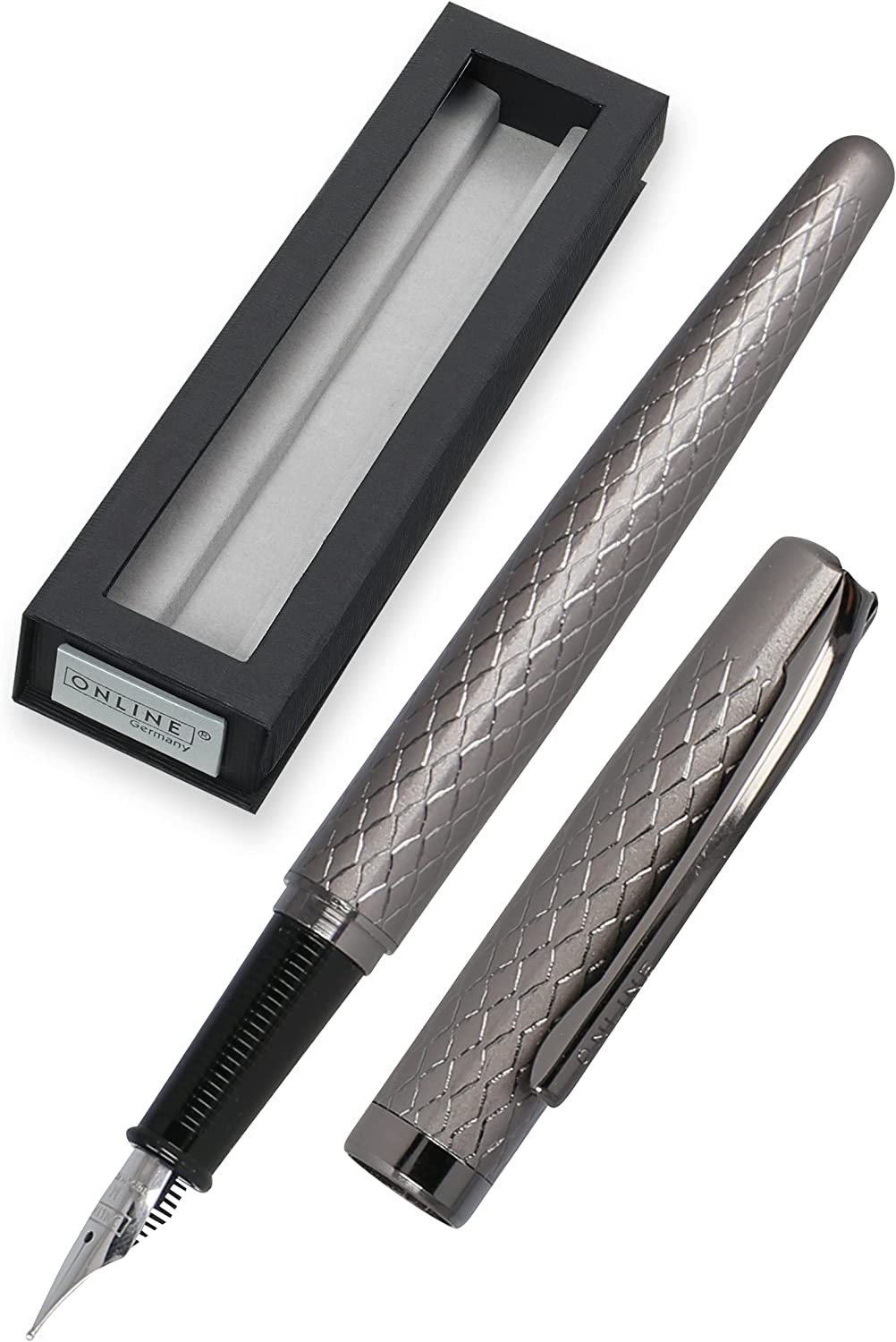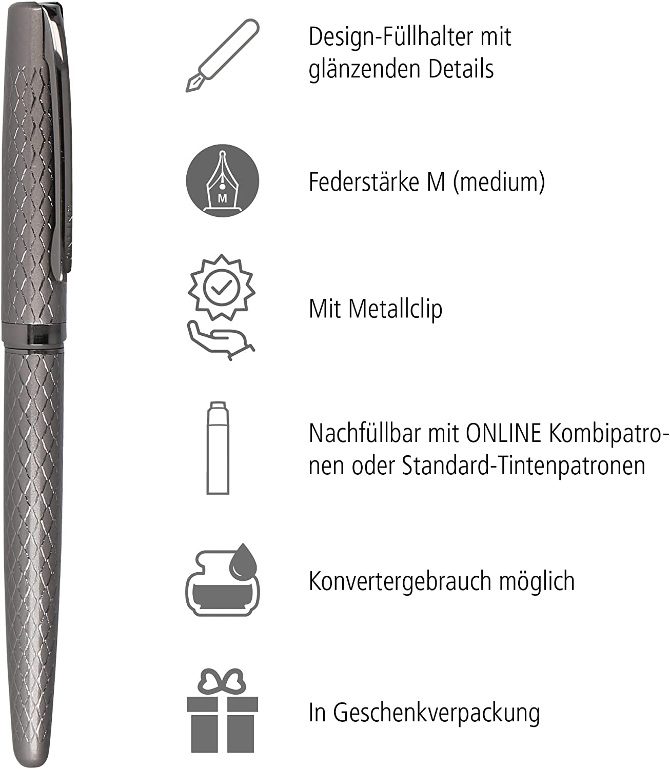 This ONLINE design metal fountain pen is equipped with a high-quality M nib (medium) and offers the highest level of writing. Delivered in a gift box, every writing instrument is an elegant gift. For standard cartridges, converter use is possible. Dimensions (LxWxH): 139 x 16 x 12 mm Weight: 19 g Colour: titan Design: Classic Line width: 0.5 mm Writing Colour: black Writing Position: Right handed