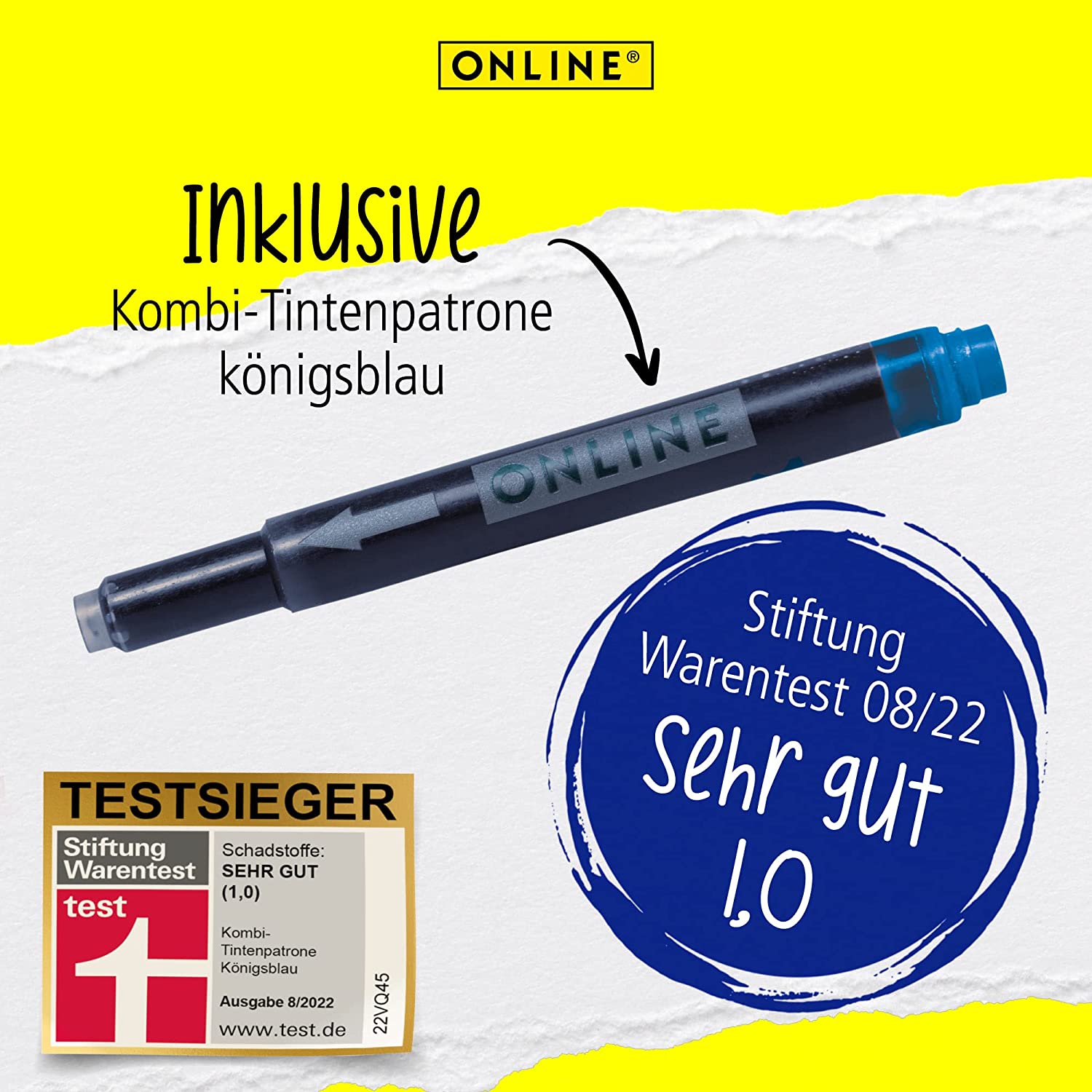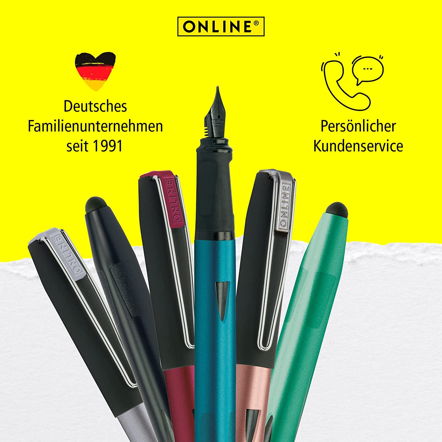 SWITCH Plus - the design fountain pen with a clip and the app made of extraordinary quality is equipped with a comfortable ergonomic grip part for classic writing on paper and a nib M with 5 years guarantee. This fountain pen impresses with ist extraordinary soft and comfortable writing experience and ist light weight which is perfectly suitable for continuous writing in everyday school life. The SWITCH Plus fountain pen is as well equipped with a stylus tip which glides lightly and conductively over capacitive screens of smartphones and tablet PCs. The special designed grip ensures a simple handling. Consequently the SWITCH Plus can be used perfectly as a fountain pen for beginners. Made of conductive plastic, the SWITCH Plus serves as a multifunctional writing instrument in school and is suitable for every age group. And the SWITCH Plus can do more: It’s the first pen with a app for writing exercises on tablets. ONLINE developed together with teachers this app for writing, letter and word exercises. Dimensions (LxWxH): 149 x 19 x 15 mm Weight: 21 g Colour: Black Design: Green Ocean Line width: M Material: Kunststoff Writing Colour: blau Writing Position: Right handed