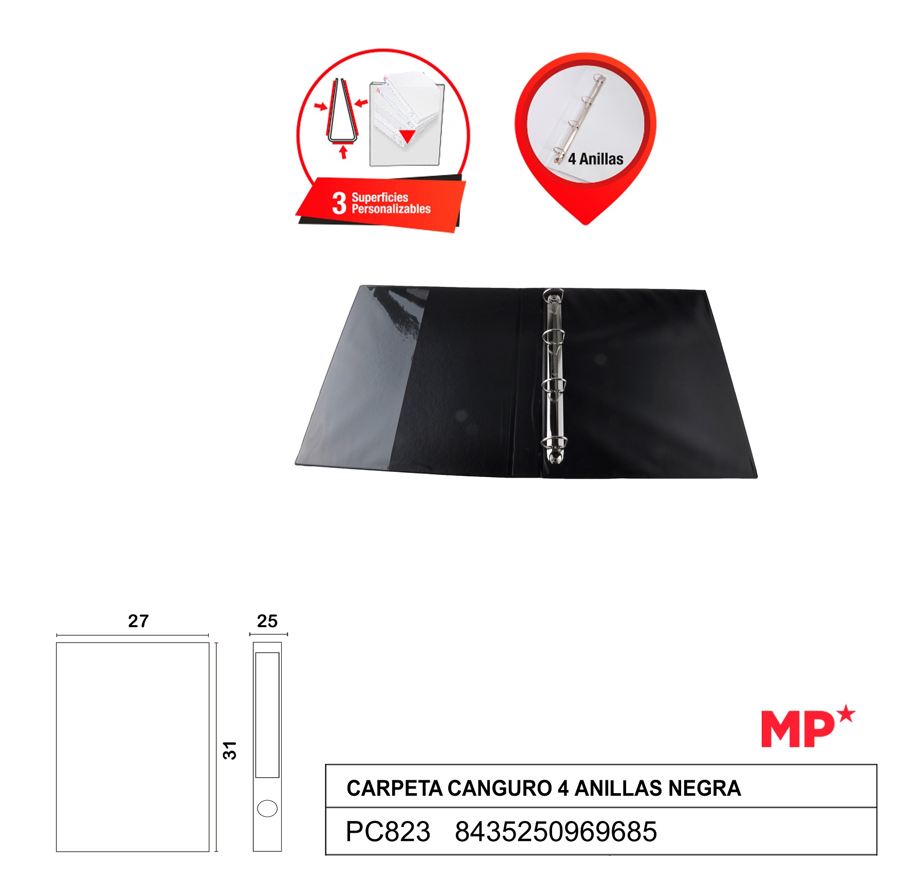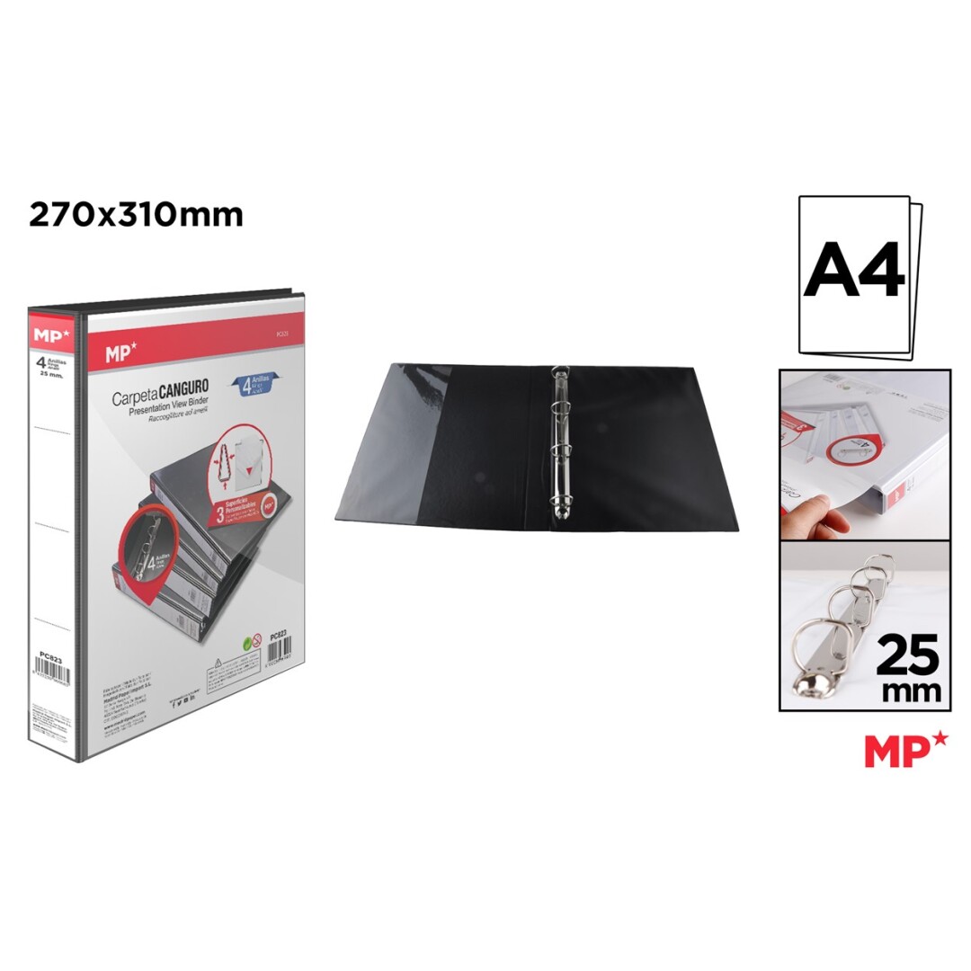 Etichete: Culoare: negru, 4 Inele de 25 mm, IPB 2.5cm, PC823, Kangaroo folder, Mix de inele, Copertă personalizabilă, Pentru prezentare proiecte, Dimensiuni folder: 270 x 310 mm, PLASTIC, caiet mecanic, 4 inele, negru, A4