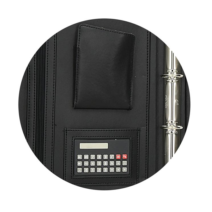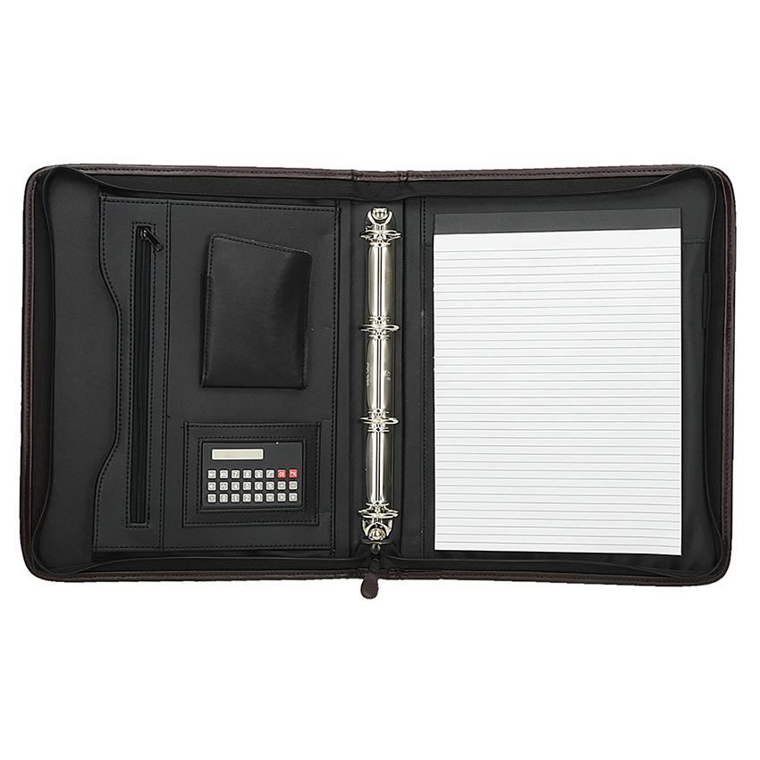Alegeti o mapa multifunctionala! Aspectul este de tip imitatie piele. Vine prevazuta cu multiple buzunare pentru depozitare stick de memorie, carti de vizita, instrumente de scris si tableta. In interior are suport pentru blocnotes si sistem metalic cu 4 inele pentru caiet mecanic