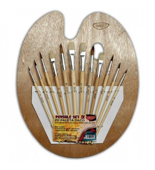 Setul contine o paleta de pictura ovala (24 x 30 cm) si 12 pensule din par natural, pentru pictura.