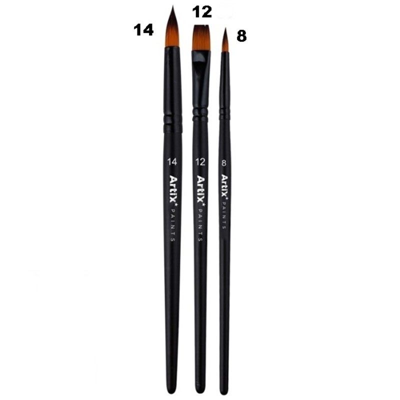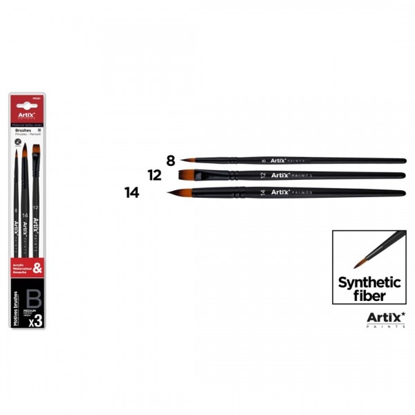 Pensula profesională pentru pictură, cu peri foarte moi din păr sintetic. Setul include două pensule rotunde pentru contur și o pensulă plată de mărime medie (M), perfecte pentru realizarea detaliilor sau aplicarea culorilor acuarele, tempera sau acrilice. Corpul pensulei este din lemn, lacuit în negru. Lungime: 20 cm. Ambalate într-un blister de 3 bucăți: 2 pensule rotunde cu numerele 8 și 14, și o pensulă plată cu numărul 12.