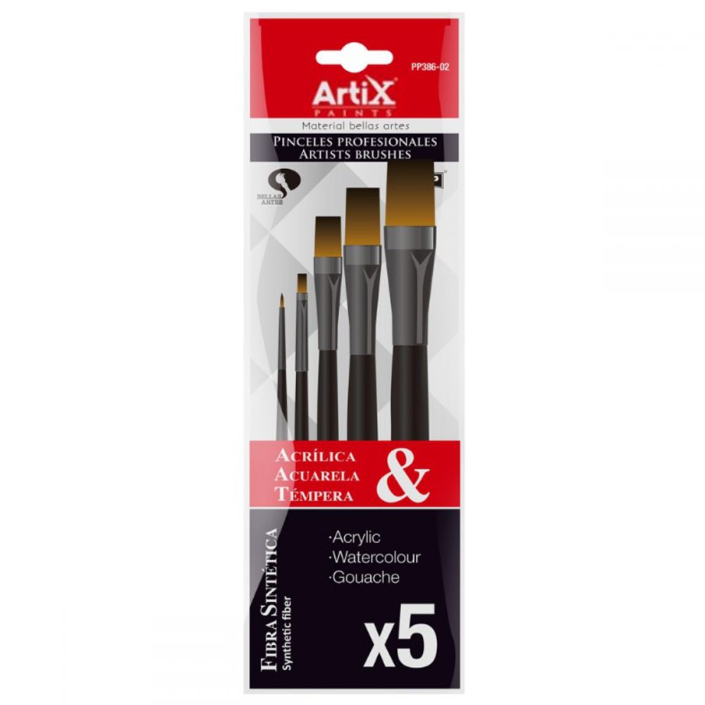 Set pensule profesionale, plate, din par sintetic, cu varf drept si coada scurta, Artix. Pensule rezistente potrivite pentru majoritatea tehnicilor de pictura, de la culorile acrilice, pana la acuarele, tempera sau guase. Acest tip de pensula este ideala pentru trasarea unor linii groase sau umplerea suprafetelor mari. Setul contine marimile: 2, 5, 10, 15, 20. Pretul se refera la un set de 5 bucati.
