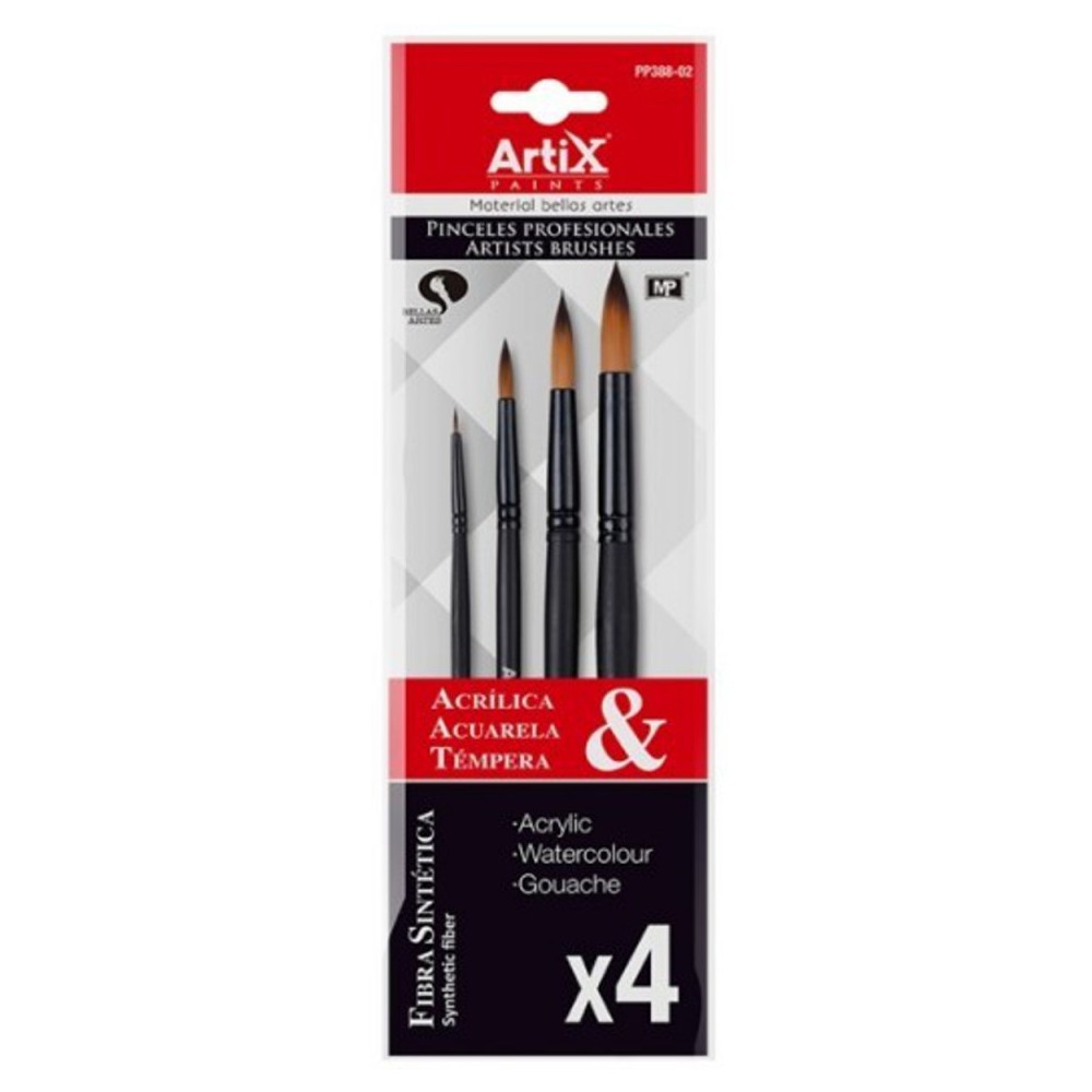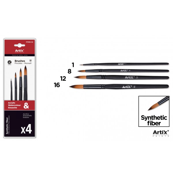 Set pensule profesionale din par sintetic, cu varf rotund si coada scurta, Artix. Pensule rezistente potrivite pentru majoritatea tehnicilor de pictura, de la culorile acrilice, pana la acuarele, tempera sau guase. Acest tip de pensula este ideala pentru trasarea unor linii groase pana la subtiri, permite realizarea detaliilor sau umplerea suprafetelor. Setul contine marimile: 1, 8, 12, 16. Pretul se refera la un set de 4 pensule.