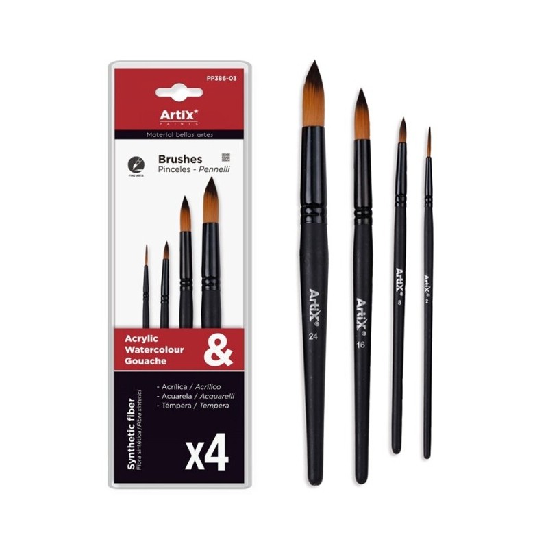 Set pensule profesionale, din par sintetic, cu varf liner sau rotund si coada scurta, Artix. Pensule rezistente potrivite pentru majoritatea tehnicilor de pictura, de la culorile acrilice, pana la acuarele, tempera sau guase. Acest tip de pensule sunt ideale pentru trasarea unor linii fine, groase - subtiri, permite realizarea de detalii, retusuri finale sau umplerea suprafetelor mici. Setul contine 1 pensula liner nr. 2 si 3 pensule rotunde nr. 8, 16, 24. Pretul se refera la un set de 6 pensule.