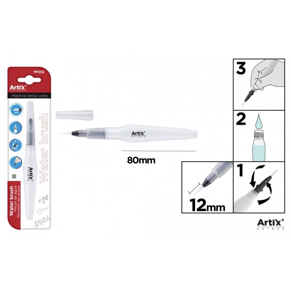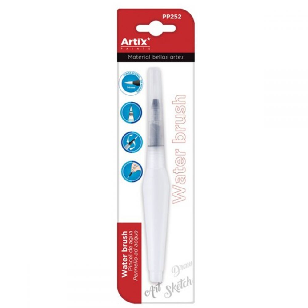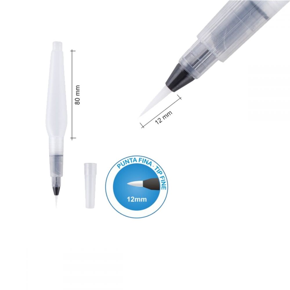 Pensula pentru acuarelă cu rezervor de apă pentru a-ți realiza vopselele în acuarelă. Lungime 80 mm. Vârf înșurubat dens pentru a umple cu apă și a putea dilua cerneala markerelor sau a creioanelor de acuarelă sau a acuarelei sau a temperelor în sine, fără a fi nevoie să diluați un pahar cu apă. Capacitate rezervor de 10 ml. Corpul său oval împiedică rularea periei. Vârf fin de 12 mm. Blister de 1 unitate.