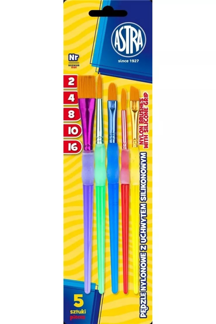 Acest set de 5 pensule ASTRA este perfect pentru a explora o varietate de tehnici de pictură, oferind confort și control sporit datorită fibrelor de nylon de înaltă calitate și a mânerelor ergonomice din silicon.