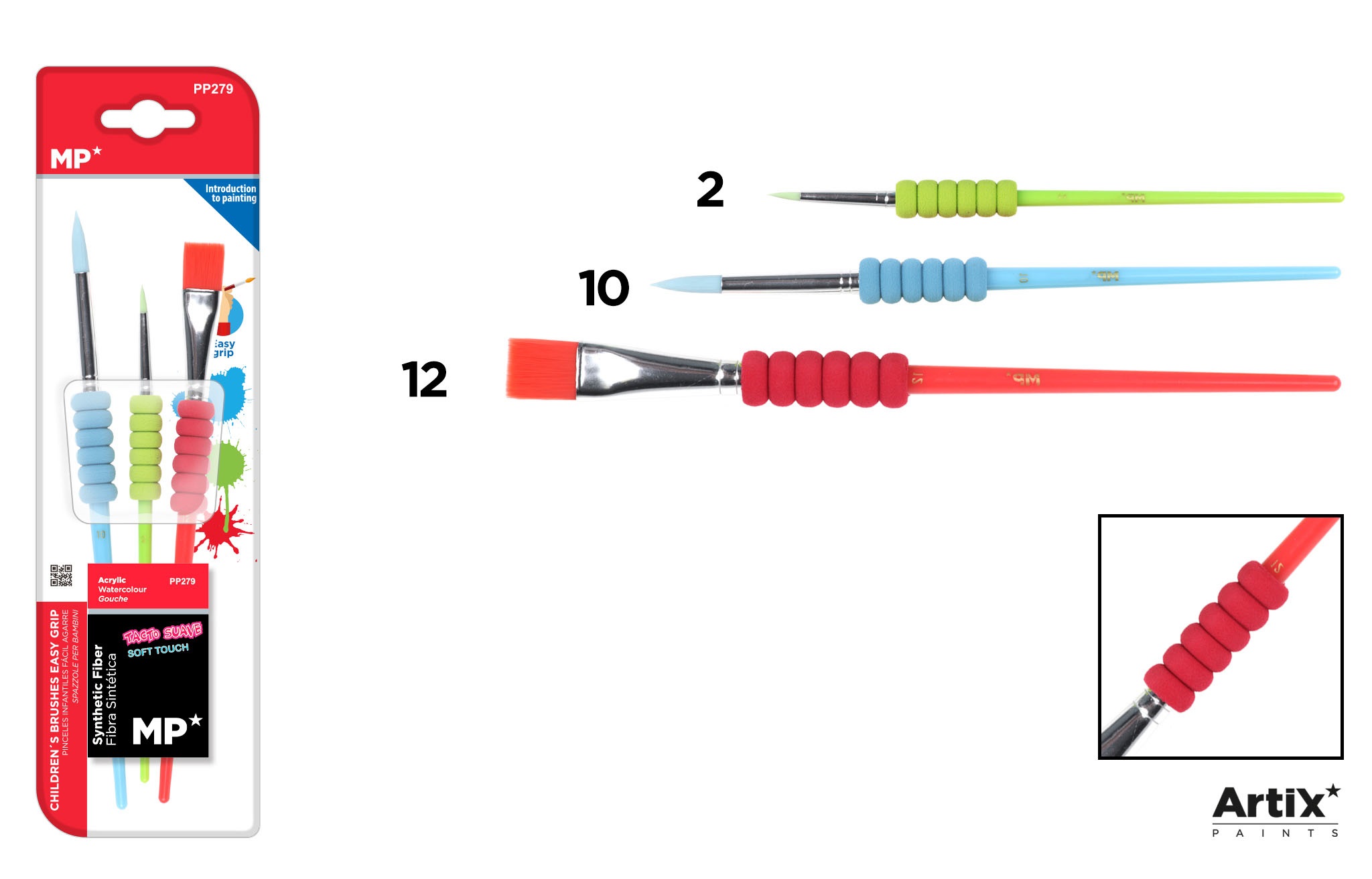 Pensula sintetica maner antialunecare 3/set MP Colours PP279. Setul are 3 pensule cu varf de forme diferite: 2 cu varf rotund si 1 cu varf plat drept. Sunt recomandate pentru copii.
