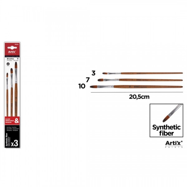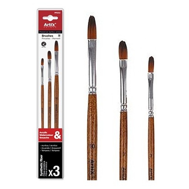 Pensule profesionale cu perii sintetici, de tip -limbă de pisică-, în diferite grosimi. Corp din lemn natural lacuit, ferrulă metalică plată și perii sintetici. Lungime: 20 cm. Pot fi utilizate cu acuarele, vopsele acrilice și TEMPERA. Datorită formei sale ovale, tip limbă de pisică, este perfectă pentru realizarea amestecurilor și tehnicilor figurative. Blister de 3 bucăți: nr. 3, nr. 7 și nr. 10.