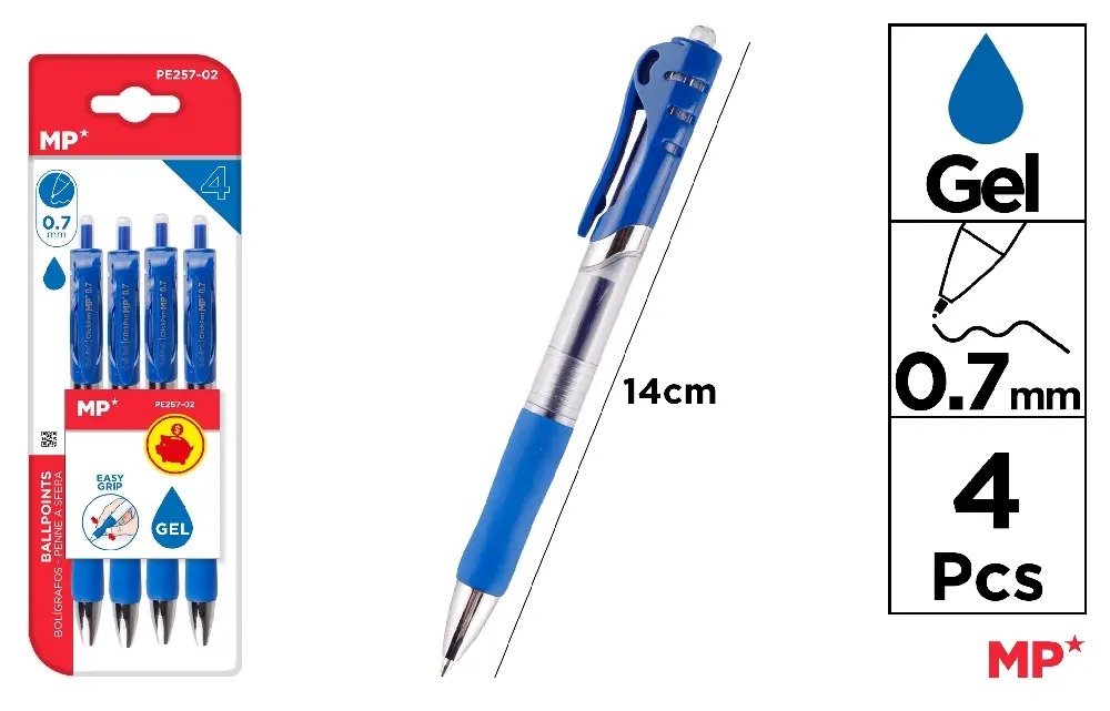 PIX CU GEL IPB 0.7MM CLICK ALBASTRU PE257-02 - Set convenabil de 4 pixuri albastre cu gel pentru o scriere lină