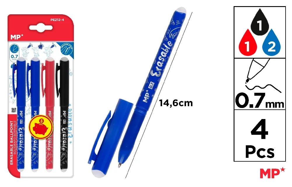 Acest set conține 4 pixuri cu mecanism de corectare (radere) inclus, dintre care două sunt albastre, unul este roșu și unul este negru. Fiecare pix are o grosime de 0.7 mm, ideal pentru scriere precisă și linii clare.