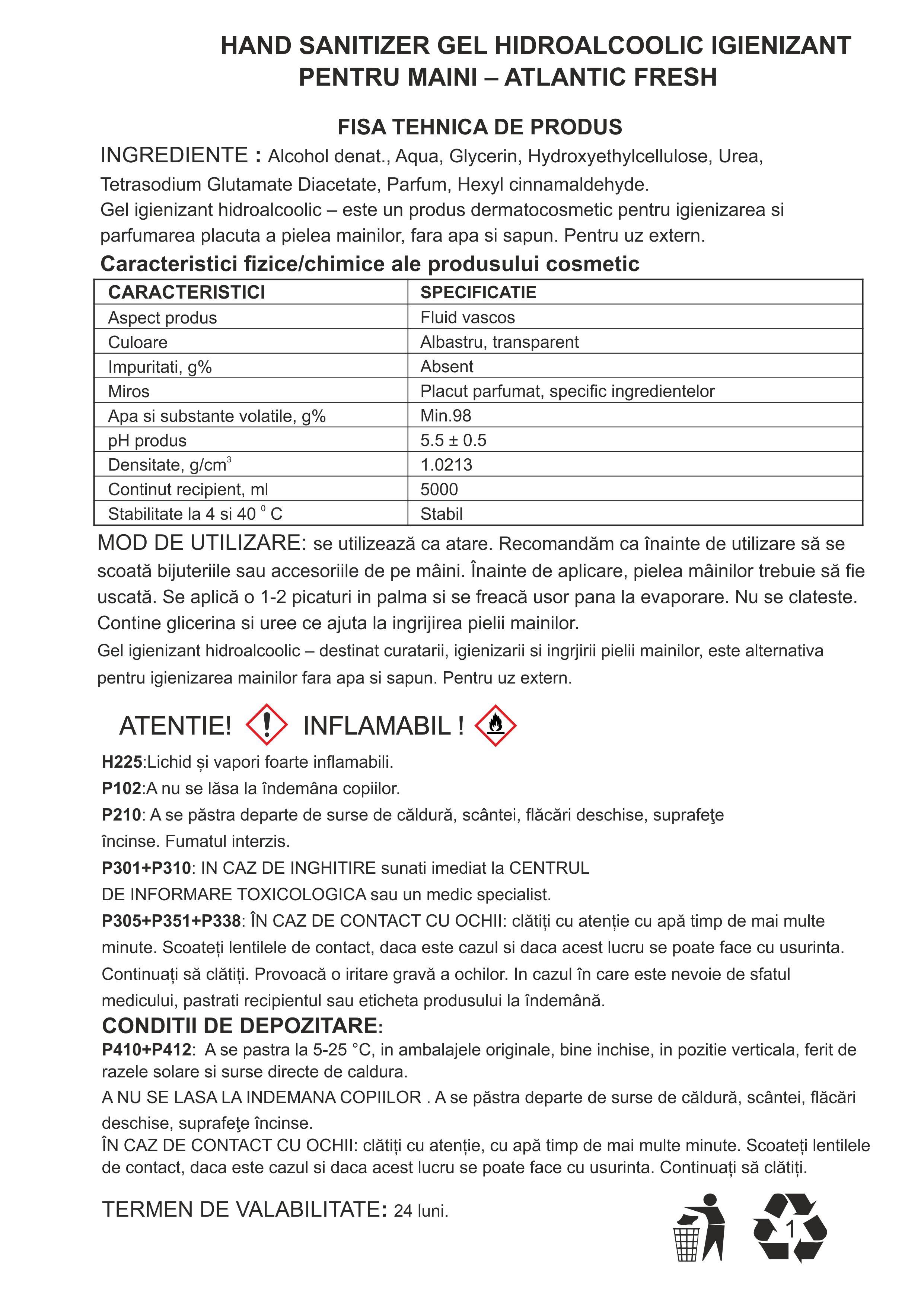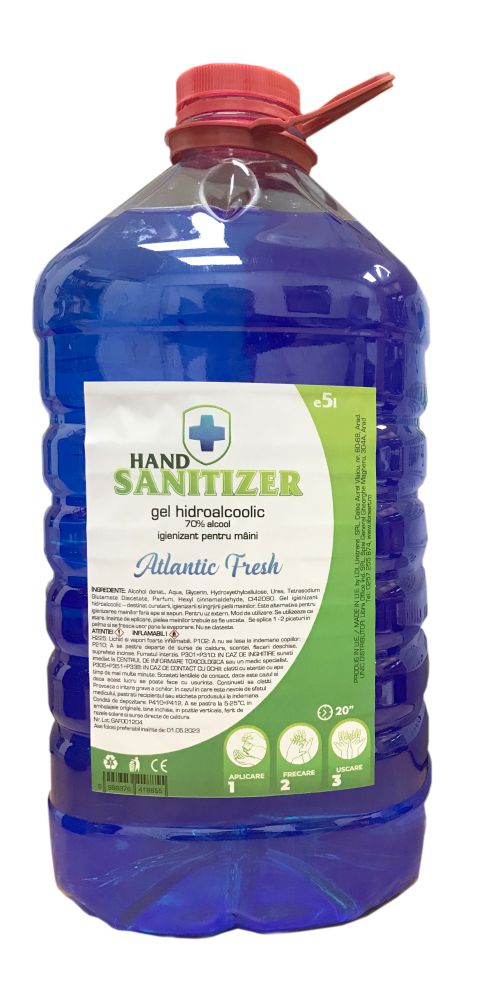 GEL IGIENIZANT DE MÂINI pe bază de alcool minim 70%, avizat dermatocosmetic, cu proprietati biocide de dezinfectare, sticla plastic de 5L. Acest produs este avizat, certificat si inregistrat ca si produs dermatocosmetic de autoritatile competente din Romania si Comunitatea Europeana si respecta toate standardele si normele de securitate, fiind testate conform standardelor in vigoare din domeniu. Este destinat curatarii, igienizarii si ingrjirii mainilor, alternativa fara apa si sapun. Nu a fost testat pe animale.