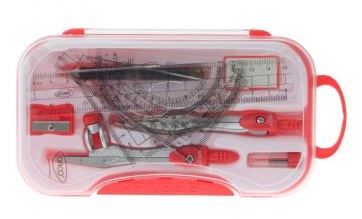 Trusa geometrie plastic, 10 piese: 2 compasuri, 2 echere, 1 liniar 15 cm, 1 raportor, 1 ascutitoare, 1 radiera, 1 creion, 1 set mine compas