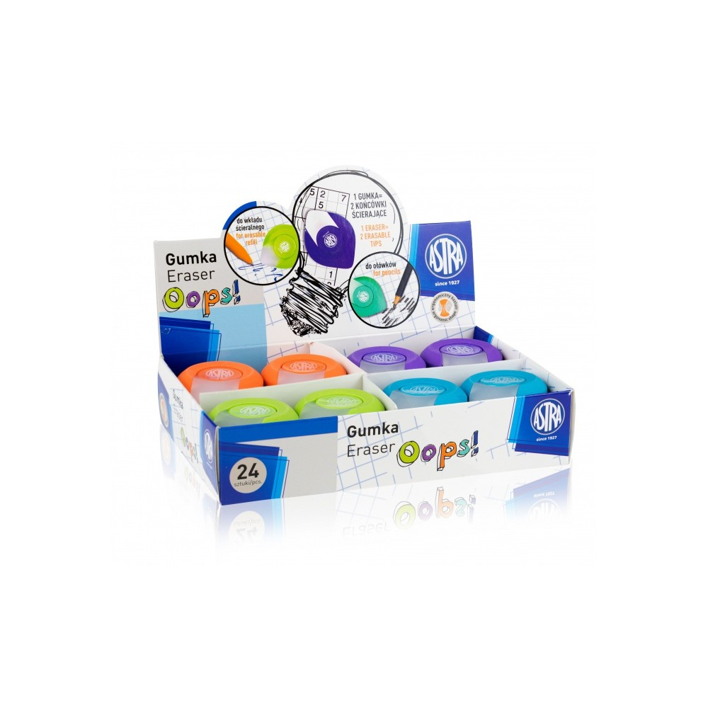 Descoperă soluția perfectă pentru o corectare curată și precisă cu radiera Astra Oops!, disponibilă pe ipb.ro. Această radieră inovatoare nu este doar un instrument de papetărie, ci un accesoriu versatil „2 în 1”, special conceput pentru a face față atât creioanelor grafit, cât și celor colorate. Cu o formă ergonomică ce permite o prindere sigură și un aspect modern în culori pastelate, radiera Astra devine rapid un element esențial în penarul oricărui elev sau pe biroul oricărui creativ care alege calitatea de pe ipb.ro.