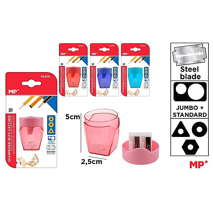 Ambalat într-un blister cu o unitate, ASCUTITOARE DUBLA CU CONTAINER IPB PLASTIC TRANSPARENT CULORI ASORTATE PA839 vine în 4 culori asortate: albastru, roz, turcoaz și coral, aducând un plus de culoare și veselie în trusa ta de scris.