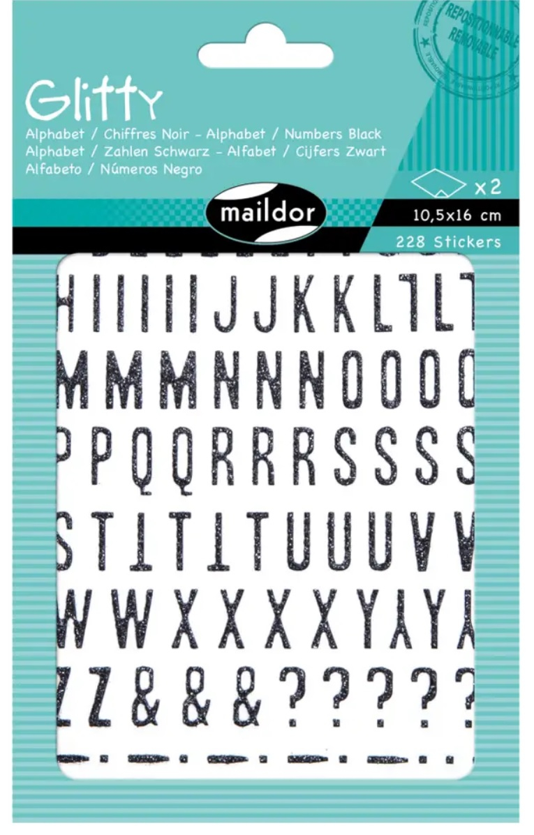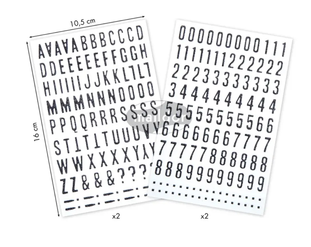 Setul Glitty conține stickere cu cifre și litere negre, perfecte pentru a adăuga un plus de strălucire creațiilor tale.