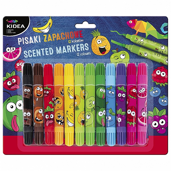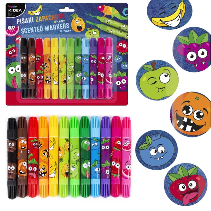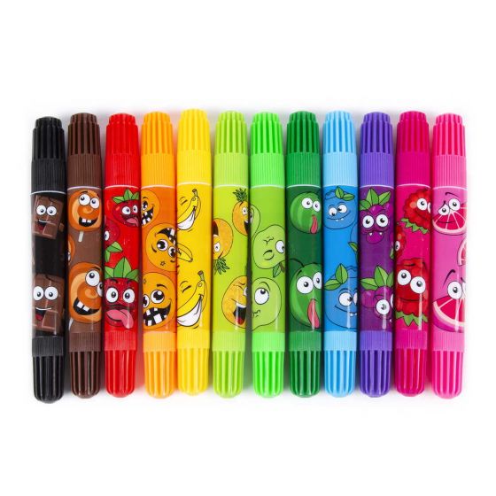 Un set de 12 carioci la îndemână, cu două capete, cu motive distractive, care miroase uimitor când scrii. Aroma fructată face produsul mai atrăgător și îi face pe copii mai predispuși să ajungă la el. Aromele lor dulci, fructate includ: portocală, măr, căpșuni, banane, afine, struguri, zmeură, ananas, pepene verde, grapefruit, caramel și ciocolată. Două vârfuri de forme diferite vă vor permite să obțineți linii de diferite grosimi. În cel mai scurt timp puteți colora suprafețe mari și puteți desena o linie precisă. Funcția 2 în 1 le face indispensabile în cutia de creion al fiecărui copil și, în plus, ocupă puțin spațiu.